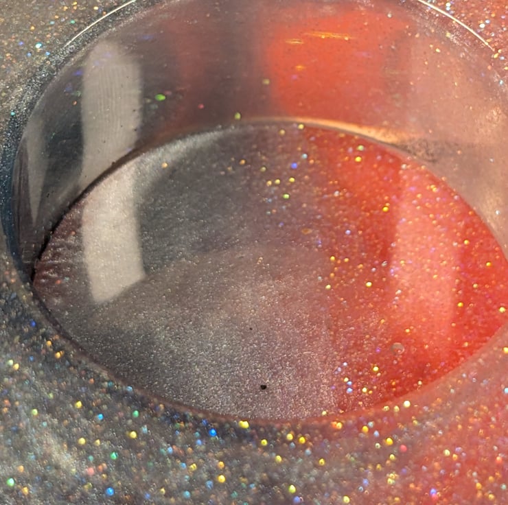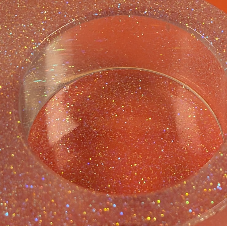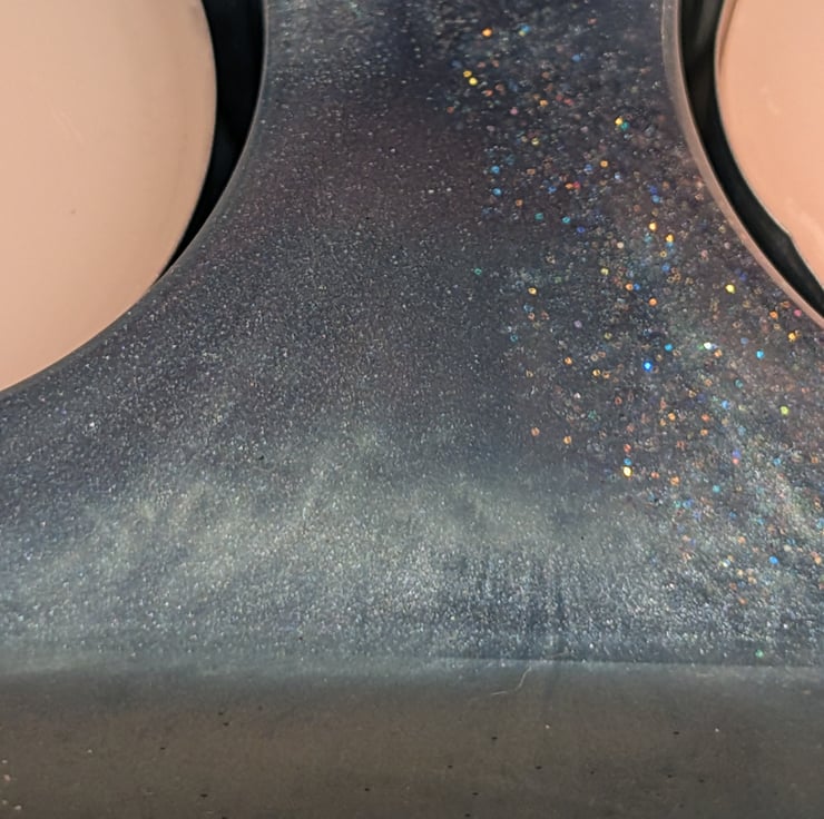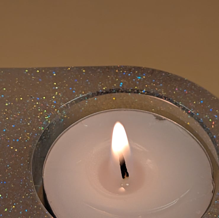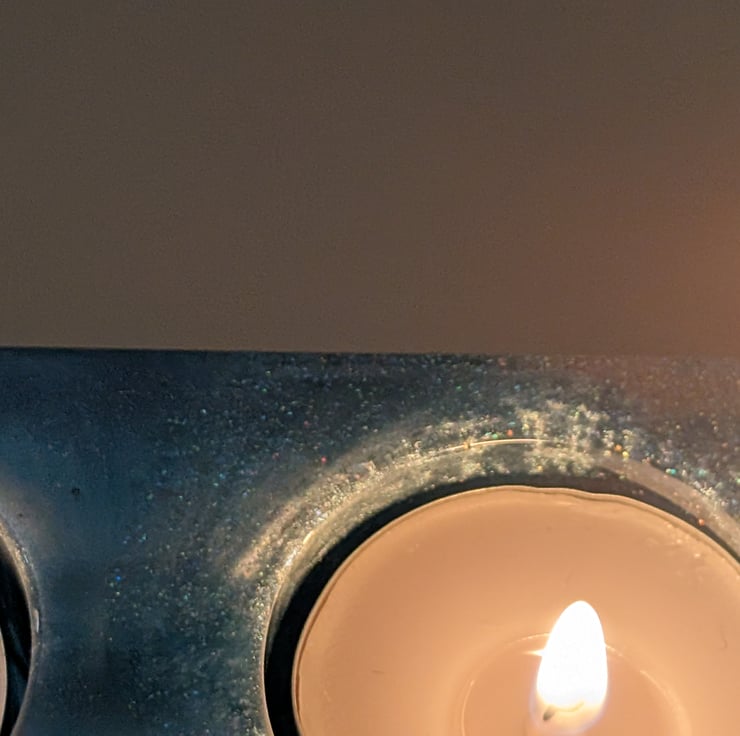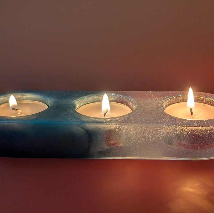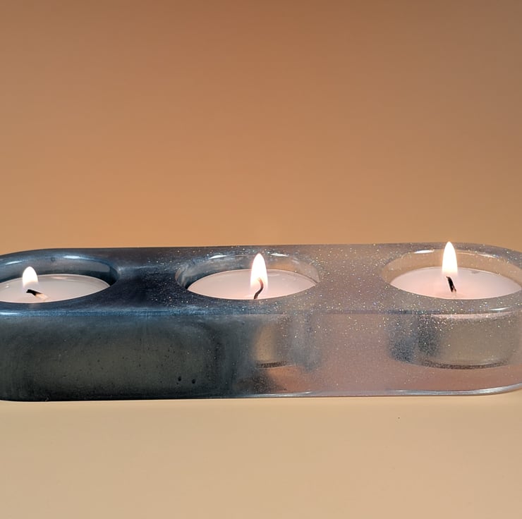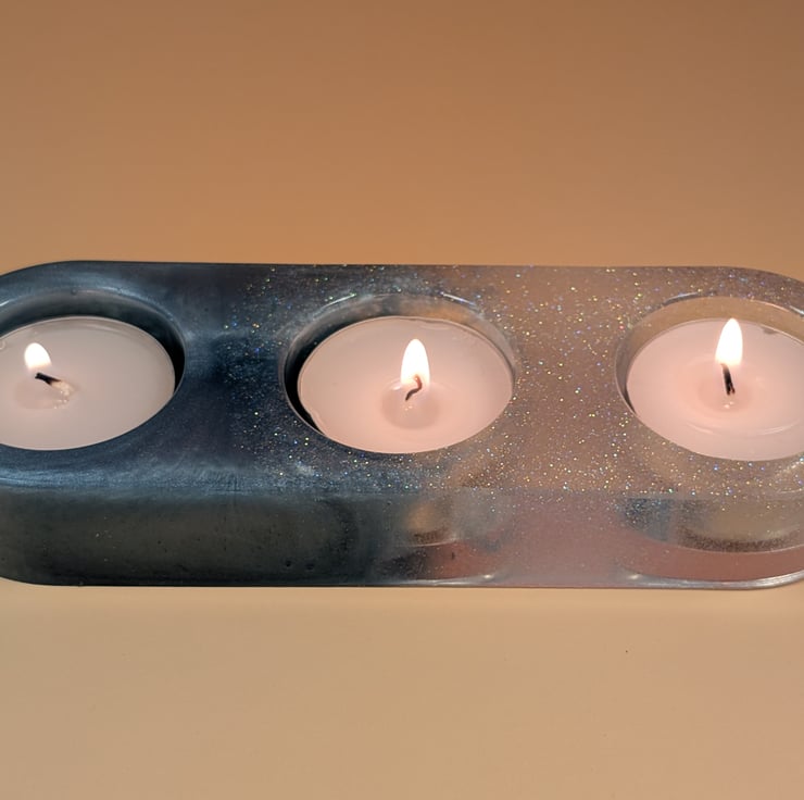 This sparkling resin tealight holder blends deep smoky blues with holographic glitter for a cosmic shimmer that shifts beautifully in the light. Cast in layers and gently domed for a smooth finish, it adds instant atmosphere to any room. The sparkle effect really comes to life when the candles are lit, catching glints of colour across the surface.