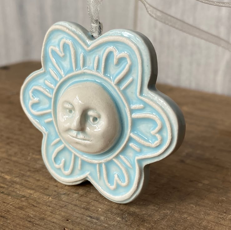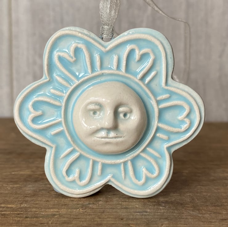 This unusual flower decoration is made from white earthenware clay and has a little moon face in the centre.It has been fired twice, once to the bisque stage and then a second firing for the glossy glaze. It measures 6 centimetres wide x 5cm height x 1cm thick and hangs from a cream organza ribbon.