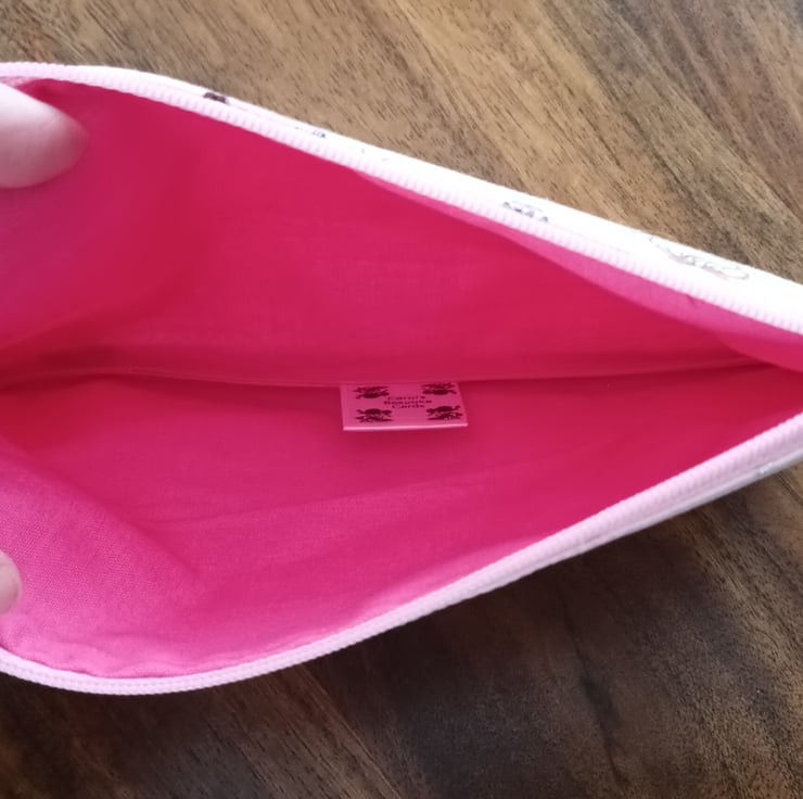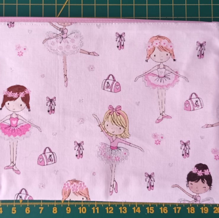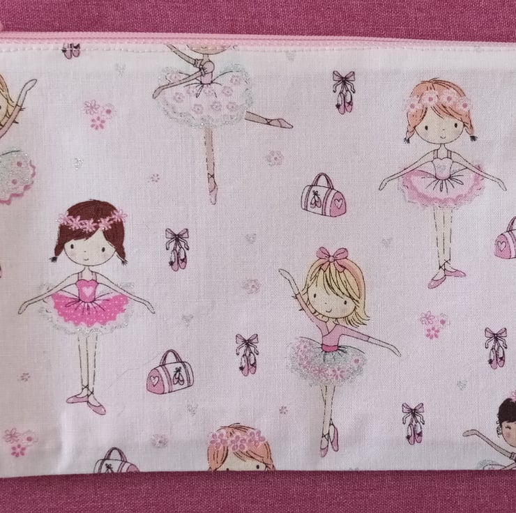 A pretty fabric pencil case with Ballerinas in sparkling Tutus, ballet shoes and holdalls. A pretty pale pink printed fabric to the outside, with a fuchsia pink lining. 100% cotton with stabilizing fabric and pastel pink nylon zipper. I also have hair scrunchies and tote bags with this design in my shop.