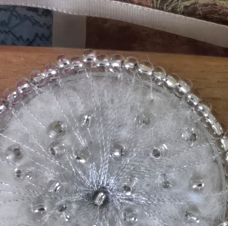 Thus is a round brooch that has been needle felted with white wool. On the top of the felt,metallic silver thread has been sewn along with silver lined seed beads. Silver lined seed beads have been sewn all around the circumference , creating a beautiful sparkling brooch reminiscent of a danelion. The diameter is the brooch is 5cm in size.