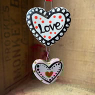 This cute little pottery cat has been hand-cut and stamped from my own design. It is made from white earthenware clay, decorated and fired. It has then been glazed with a lovely glossy glaze and fired again to 1100 degrees. It hangs from a cream organza ribbon. 7cm wide x 5.5cm high x 0.8cm deep.