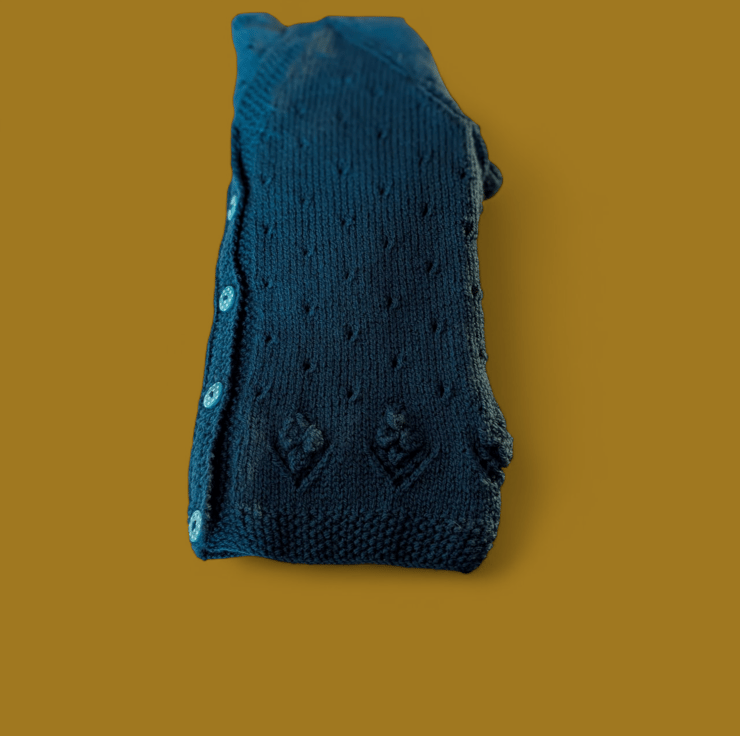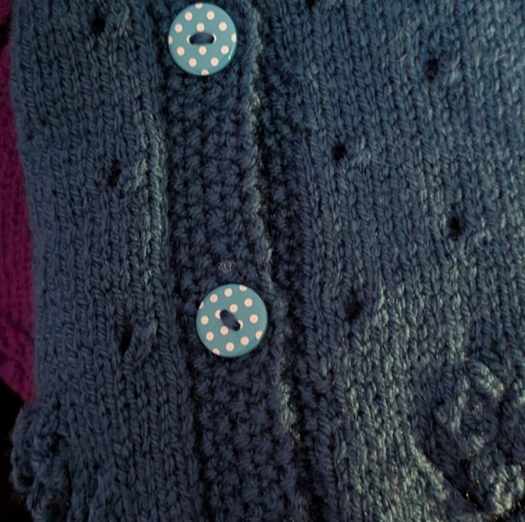 Knitted in DK-weight yarn in the deep Blue Whale shade, the cardigan has a cozy yet polished feel, perfect for layering. The look is finished with adorable polka dot buttons that bring a fun and whimsical flair.