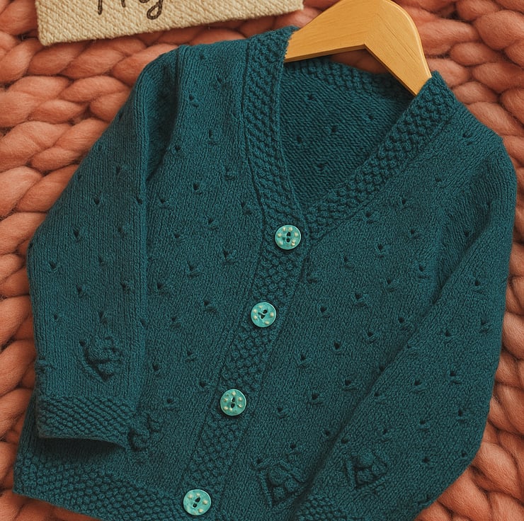 Add a touch of texture and charm to your little girls handmade wardrobe with this elegant cardigan. Featuring a beautifully detailed bobble design in a diamond pattern around the base and sleeves, this piece is both classic and playful.