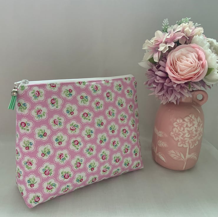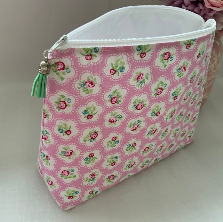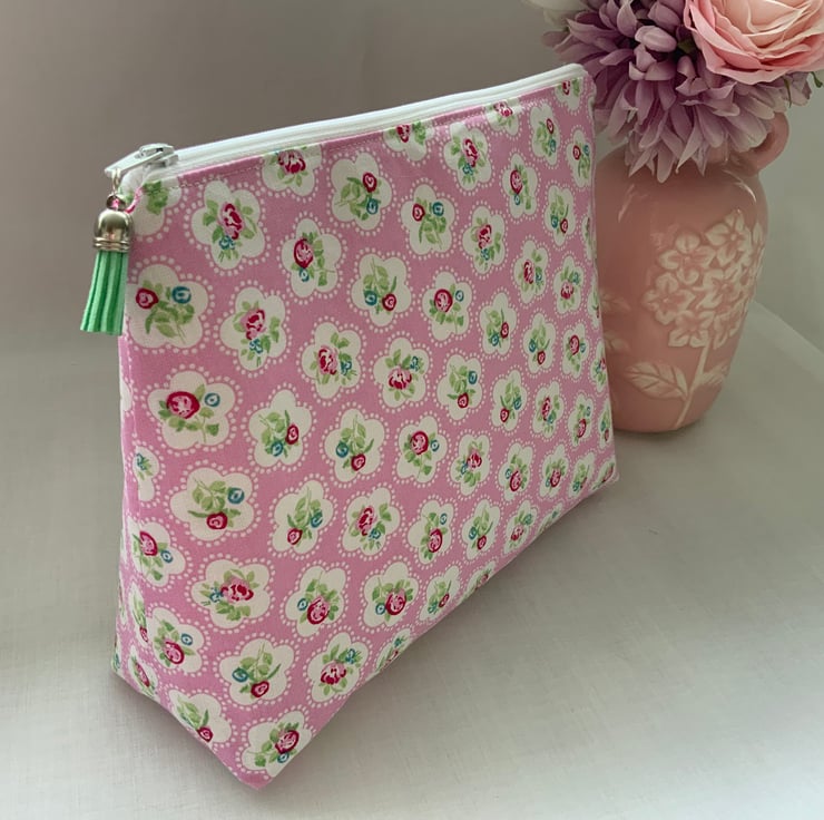 A gorgeous wash bag perfect for storing your toiletries or cosmetics. It would look stylish on display in a bathroom or on a dressing table but also perfect as a travel accessory to carry your toiletries or cosmetics. This bag is interfaced to give it structure and is lined with a white water resistant fabric. The zip is finished with a matching tassel.