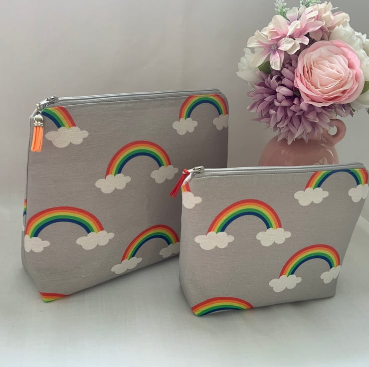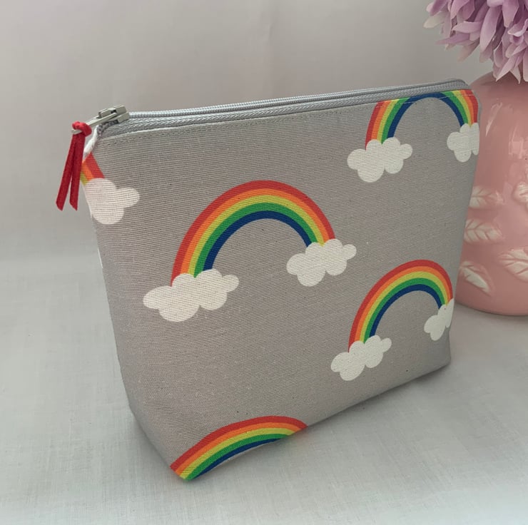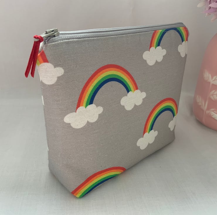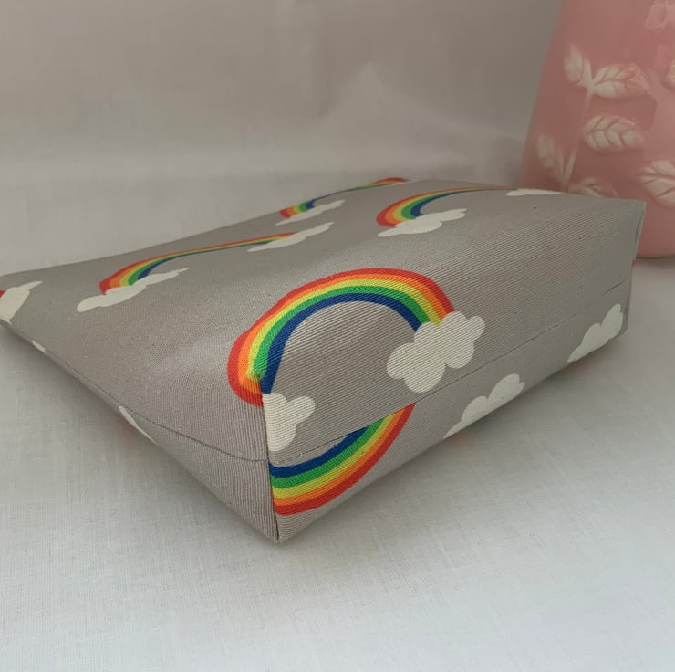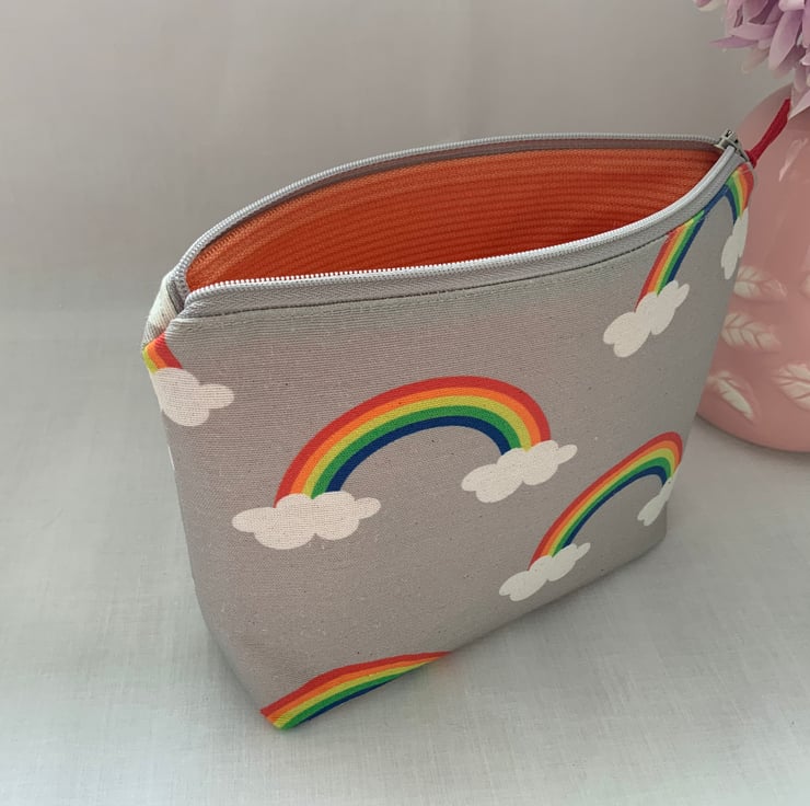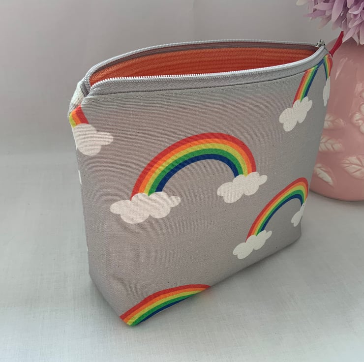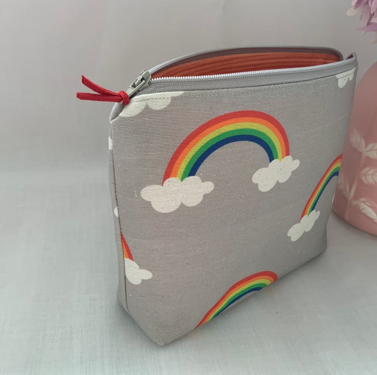 Square bottomed zipped cosmetic bag purse made from rainbow cotton fabric. This purse is lined with orange cotton and interfaced to give it structure. Finished with faux suede cord on zip.