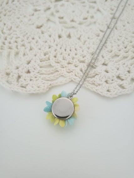 This charming necklace features a meticulously crafted pendant, forming a delicate cluster of miniature blossoms in soft, ethereal shades of light green and serene blue. Each tiny flower is accented with a subtle, sparkling crystal at its centre, adding a touch of understated brilliance. The floral cluster hangs gracefully from a slender, silver-toned chain, designed to rest elegantly on the décolletage. Inspired by the natural beauty of a spring garden, this necklace is a perfect accessory to infuse any outfit with a fresh, feminine, and whimsical touch.