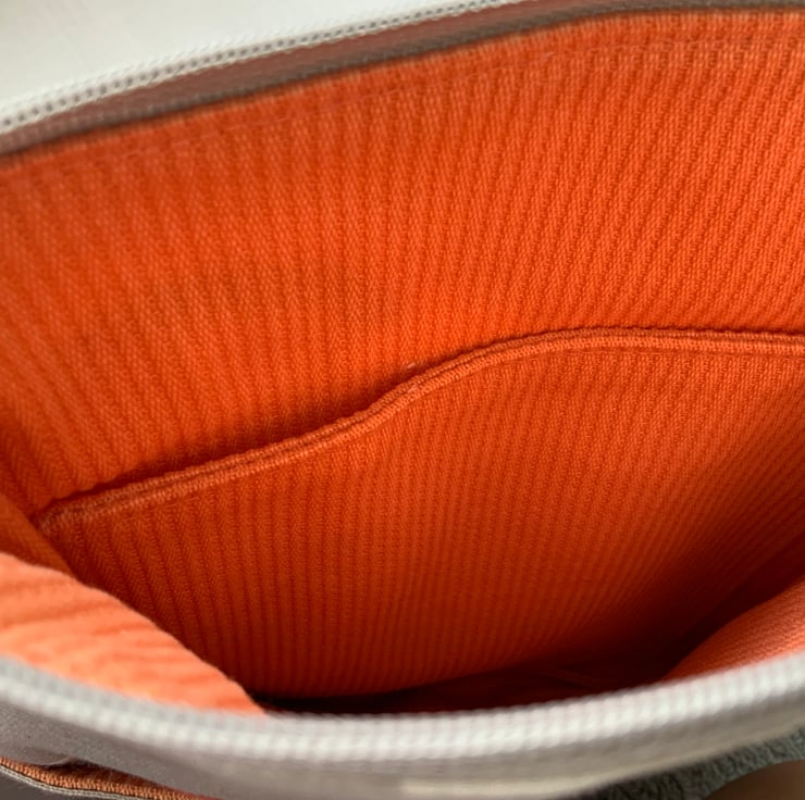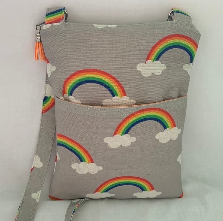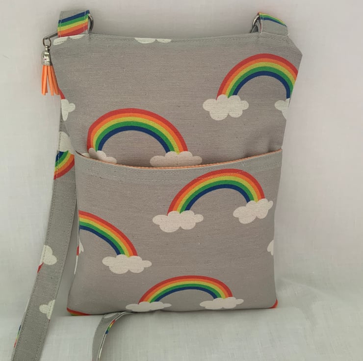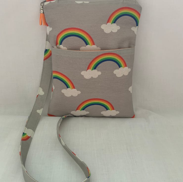 Handmade fully lined crossbody bag with zip fastening, front pocket and adjustable strap. This bag is interfaced to give it structure and lined in cotton with a small slip pocket. Fitted with a fabric strap which is adjustable. Decorative tassel attached to top zip.