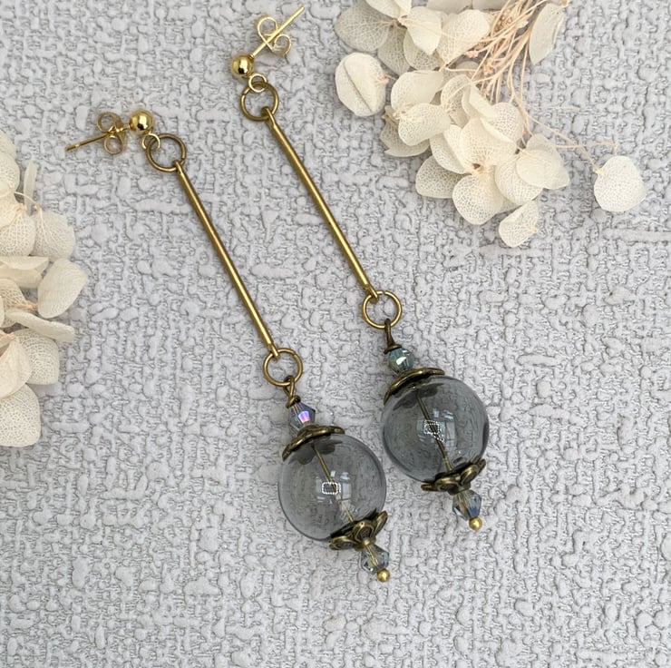 These eye-catching earrings are made with smokey grey coloured hollow globe glass beads. They include vintage bronze tone bead caps and are finished antique gold connectors and they are finished with gold-plated earring posts. The earrings are 8cm in total length.