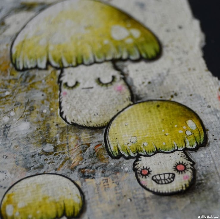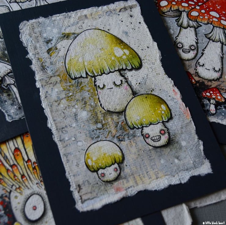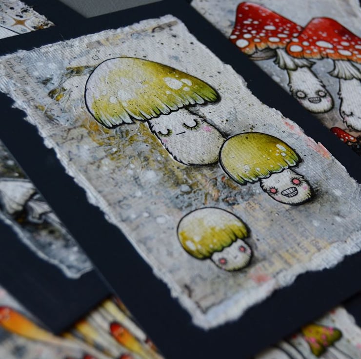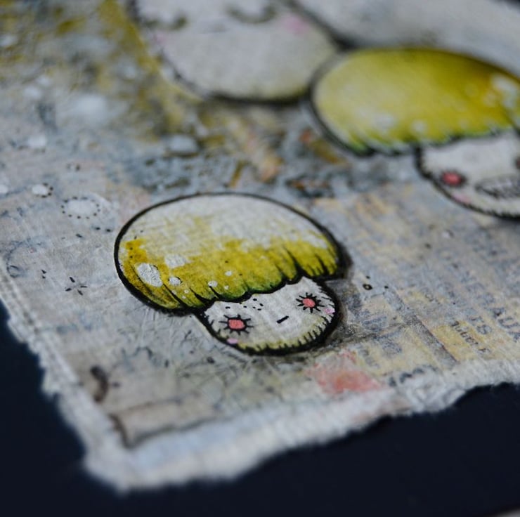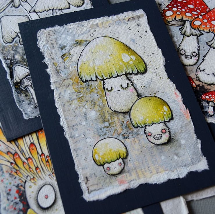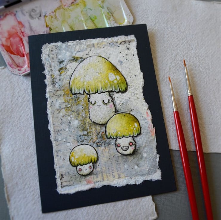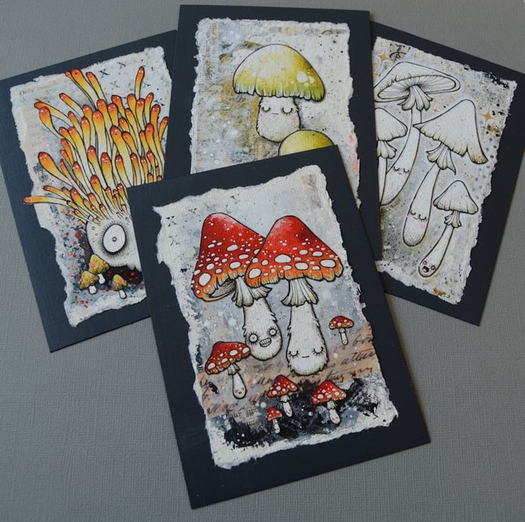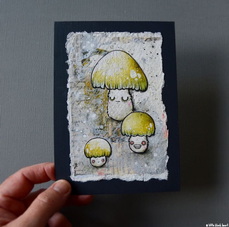 this artwork is an original collaged piece on khadi paper, made with layers of paint and papers of various types, such as vintage, printed and handmade tissue papers. the mushrooms are hand drawn on a separate piece of khadi paper, coloured with watercolour paints, and each one is then cut out, and added as a final layer to the collage. the whole piece is then mounted onto an A6 sized piece of textured paper (300gsm), which i have painted with a paynes grey to give a dark surround/background.