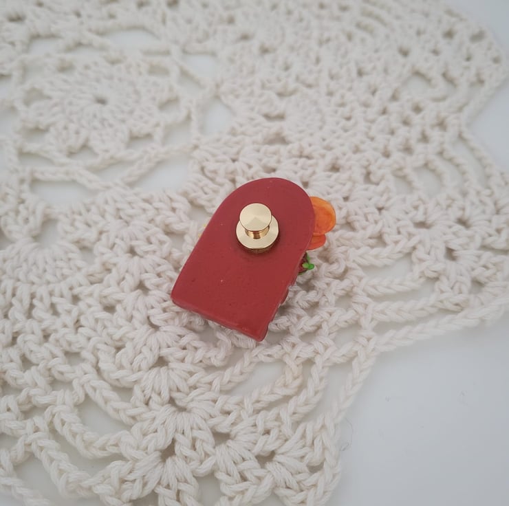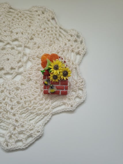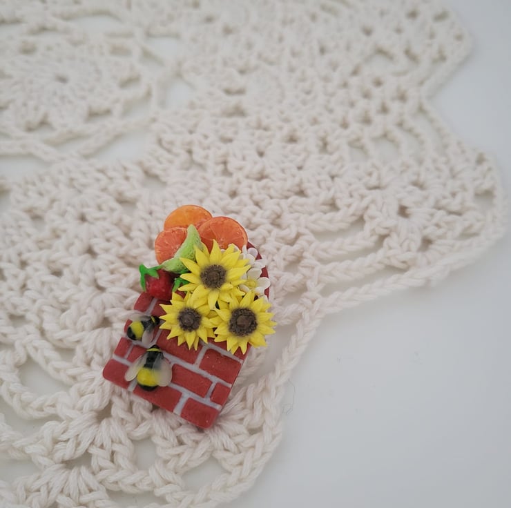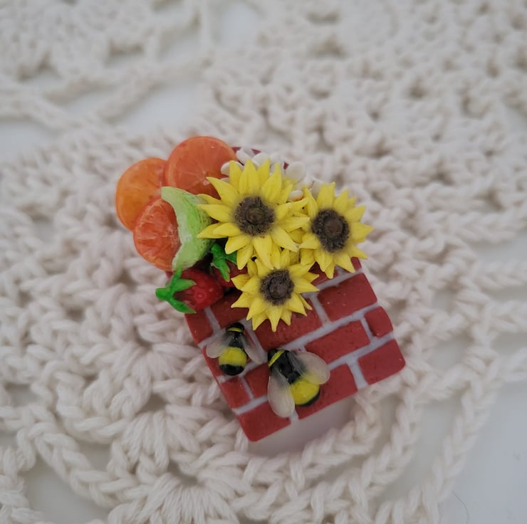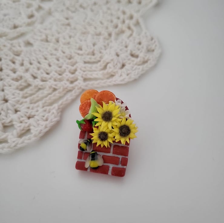 he inspiration for this brooch is a bright and cheerful summer garden, bursting with the warmth of sunflowers and the sweetness of ripe fruit. Imagine a sunny afternoon, the air filled with the buzzing of bees as they flit between vibrant blooms, and the scent of citrus and ripe strawberries mingling in the air. This brooch aims to capture that feeling of joyful abundance, bringing a miniature slice of summer's vibrant energy to any outfit.