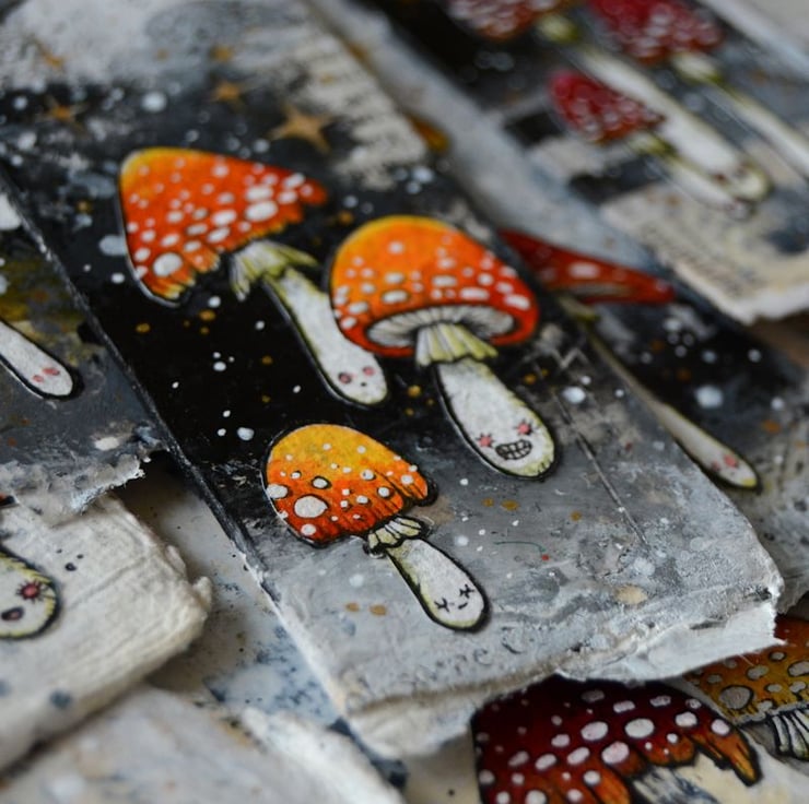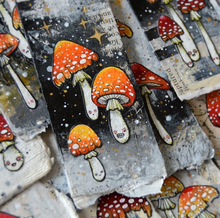 i have added a variety of vintage writing, book and tissue papers, paint and inks, in thin layers, to create a grungy style background. the mushrooms were drawn on a separate piece of thinner khadi paper, and coloured with watercolour and metallic paints, before being cut out and then added as a final layer.