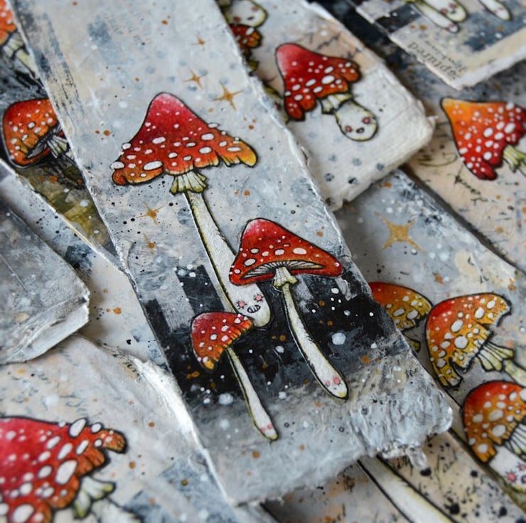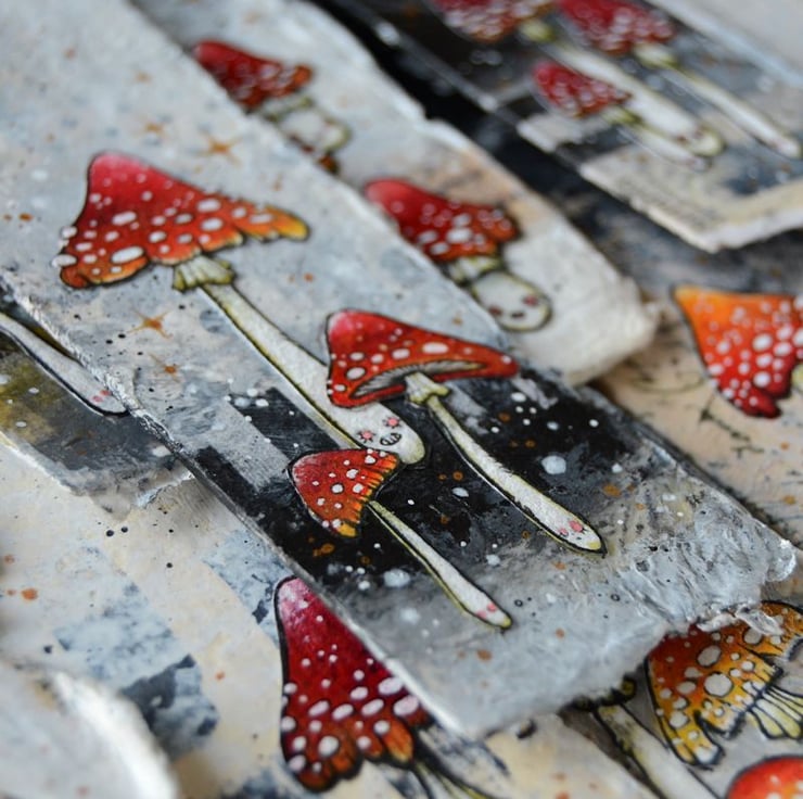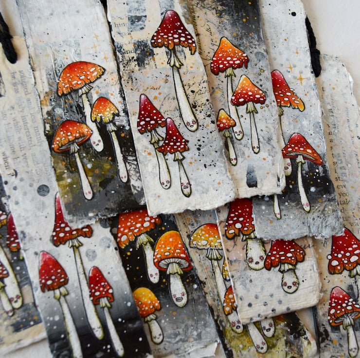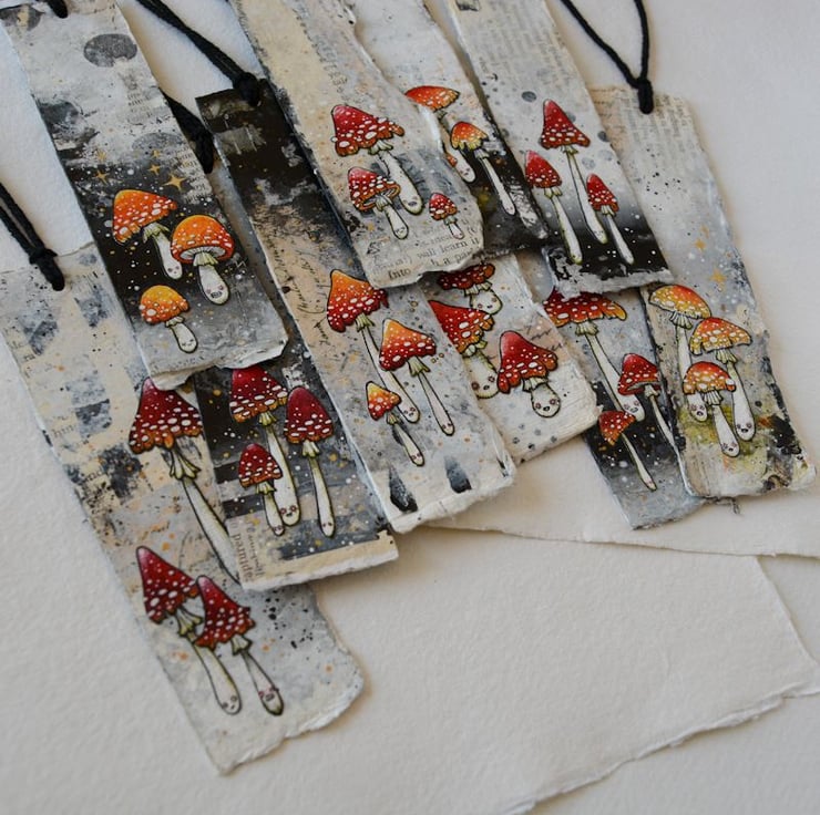 i have added a variety of vintage writing, book and tissue papers, paint and inks, in thin layers, to create a grungy style background. the mushrooms were drawn on a separate piece of thinner khadi paper, and coloured with watercolour and metallic paints, before being cut out and then added as a final layer.