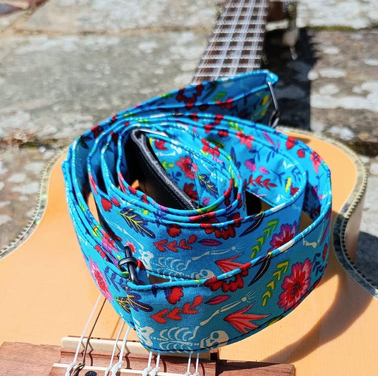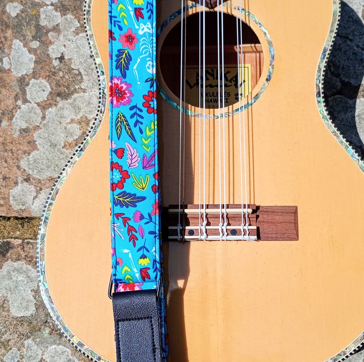 This ukulele strap is made from high quality printed cotton fabric. It has a bright blue background covered in pretty, multi-coloured flowers and leaves and quirky dancing skeletons. The strap ends are hand-cut and punched from black faux leather.