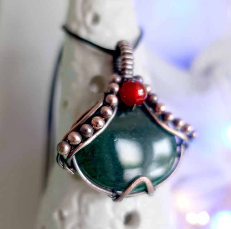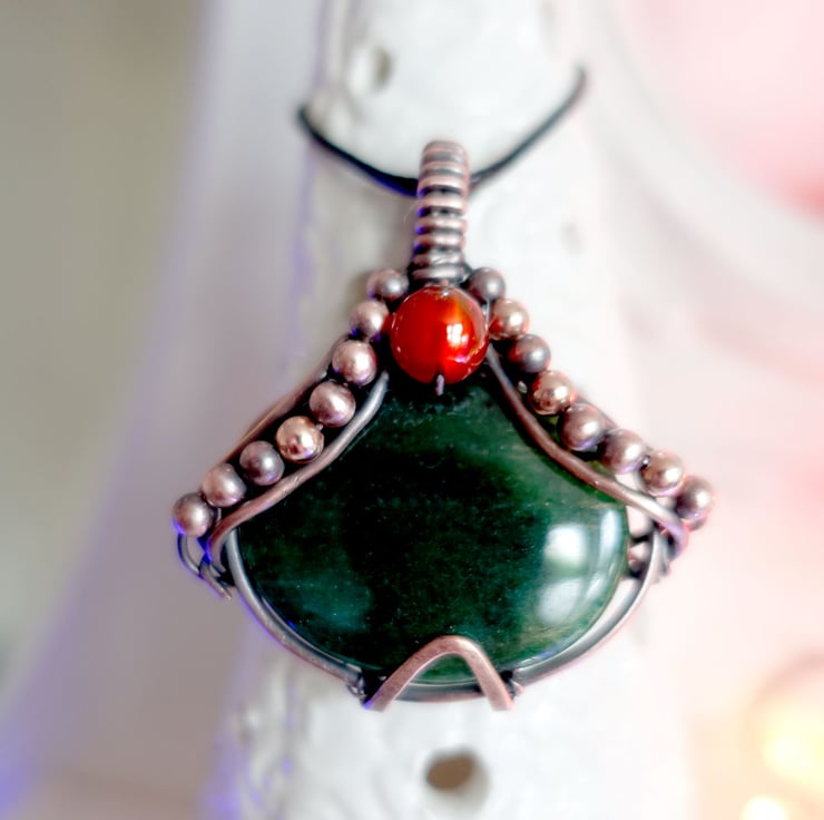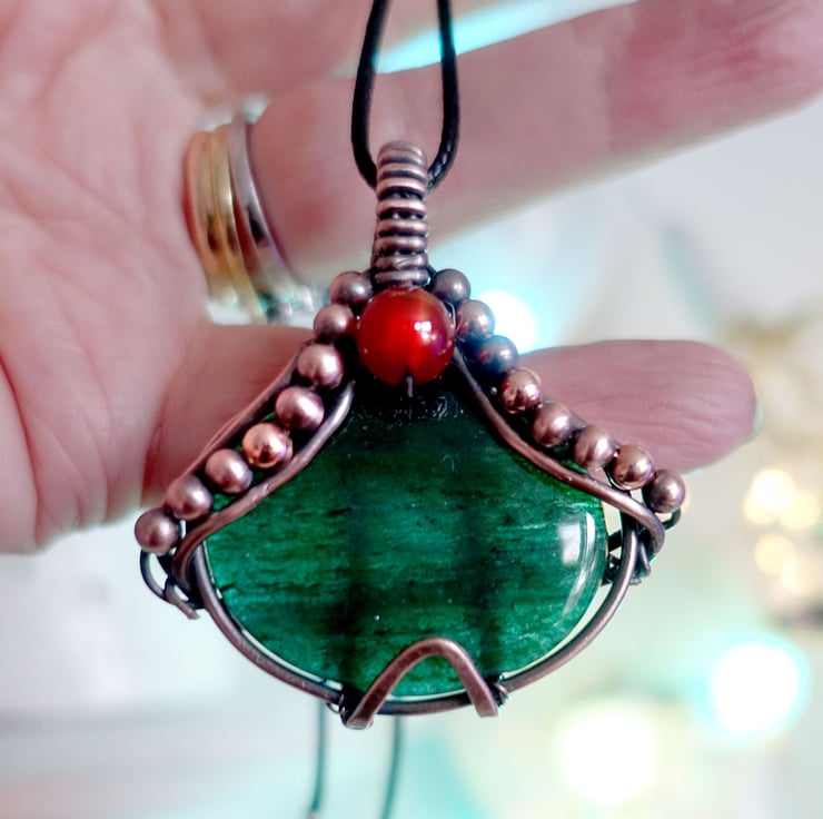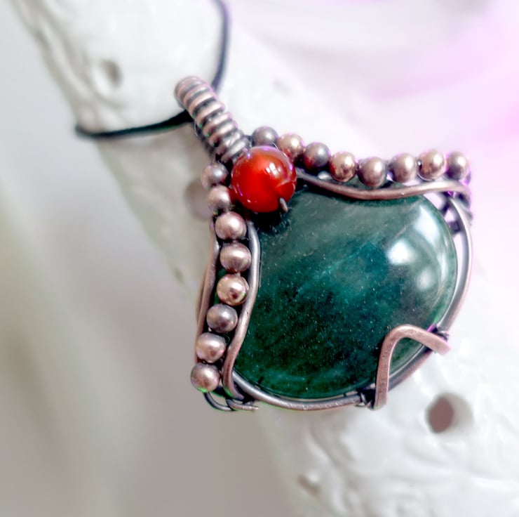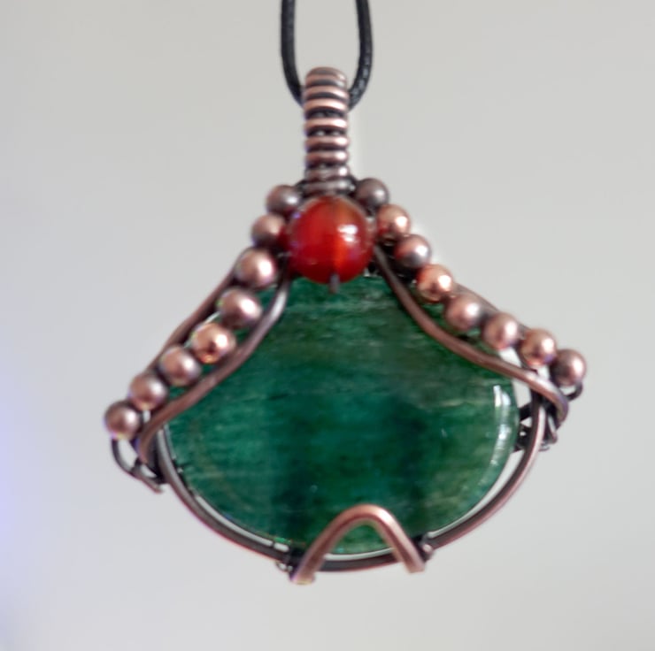 Lovely Art Nouveau inspired design for this green aventurine crystal with an orange carnelian bead and copper wire wrap and copper bead detail.