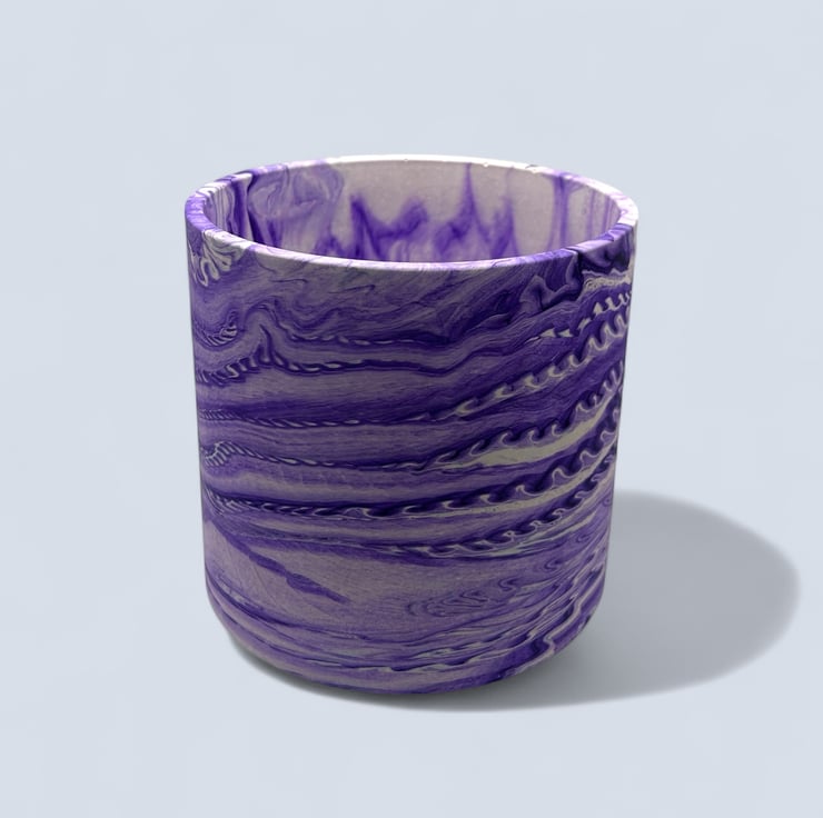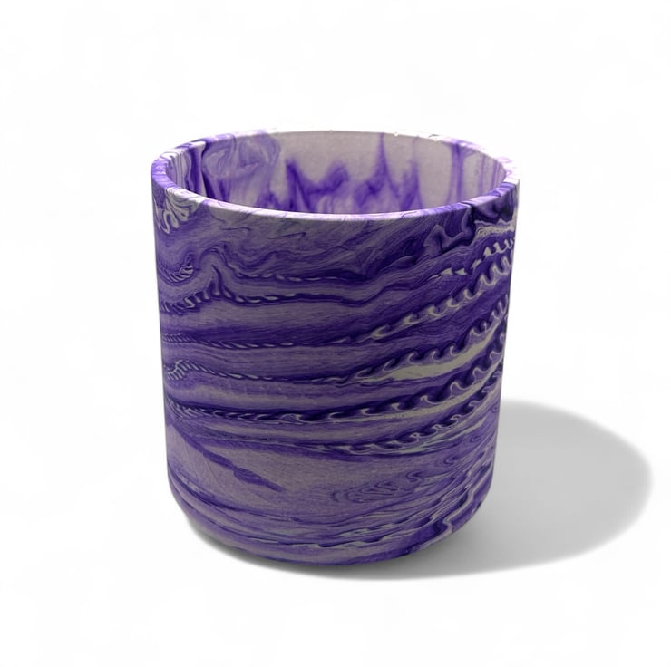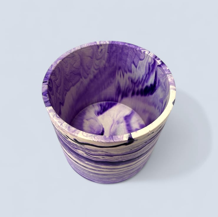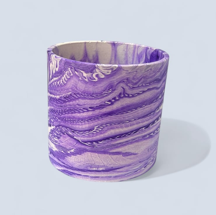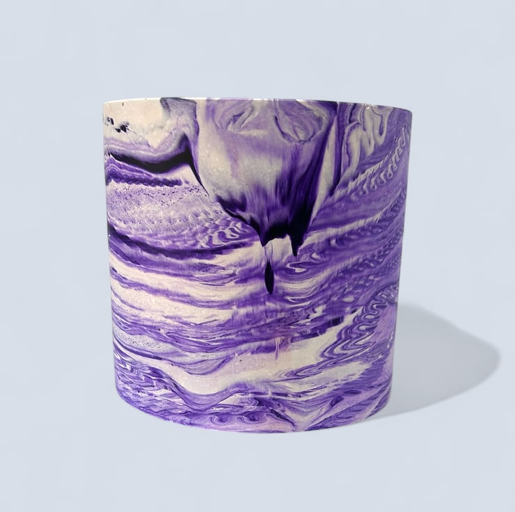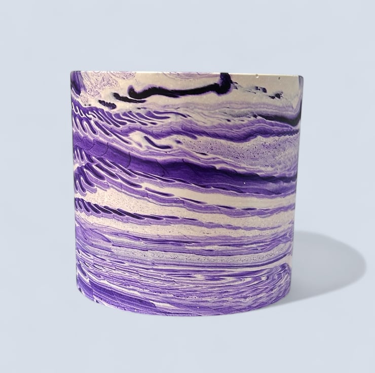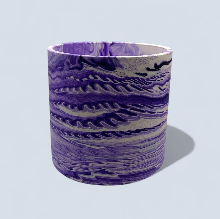 This extra-large handmade plant pot features a stunning purple marble effect, showcasing various shades of purple, lilac and white. It is thoughtfully crafted from Cassini, a material commonly used for restoring and repairing marble and stone, giving the pot a smooth and tactile finish reminiscent of marble. Additionally, it is water and weather-resistant, making it suitable for both indoor and outdoor use.