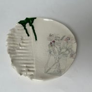 Handmade, kiln fired and decorated with hand drawn flowers, this decorative saucer is one of a kind .