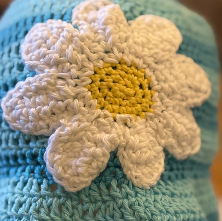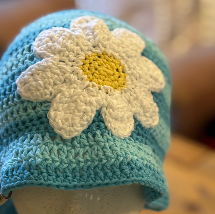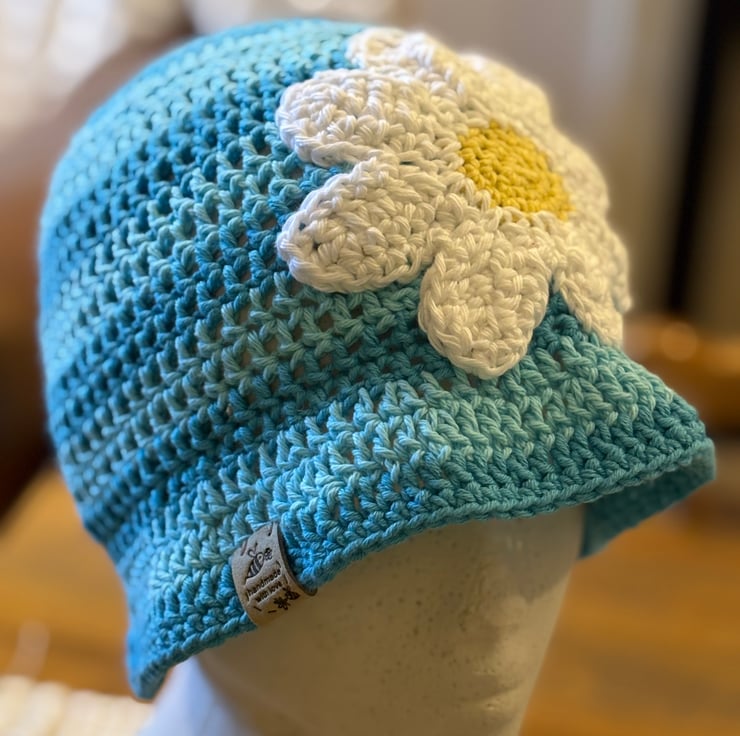 Crochet bucket hat hand made by me. Soft cotton yarn great, pale turquoise stripes with lovely big daisy embellishment,one size approximately 21” diameter