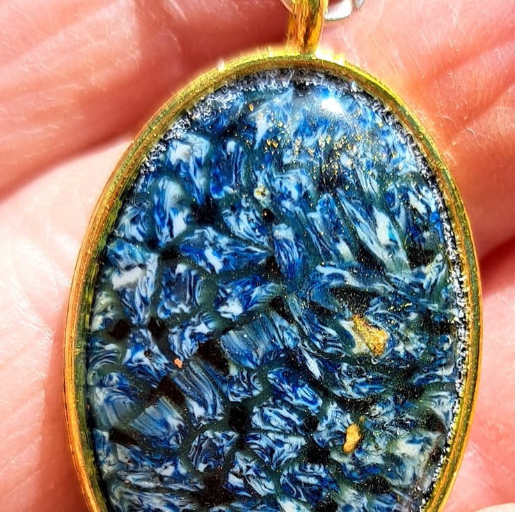A gold oval shaped bezel filled with polymer clay on a rope necklace, finished with a coat of resin.