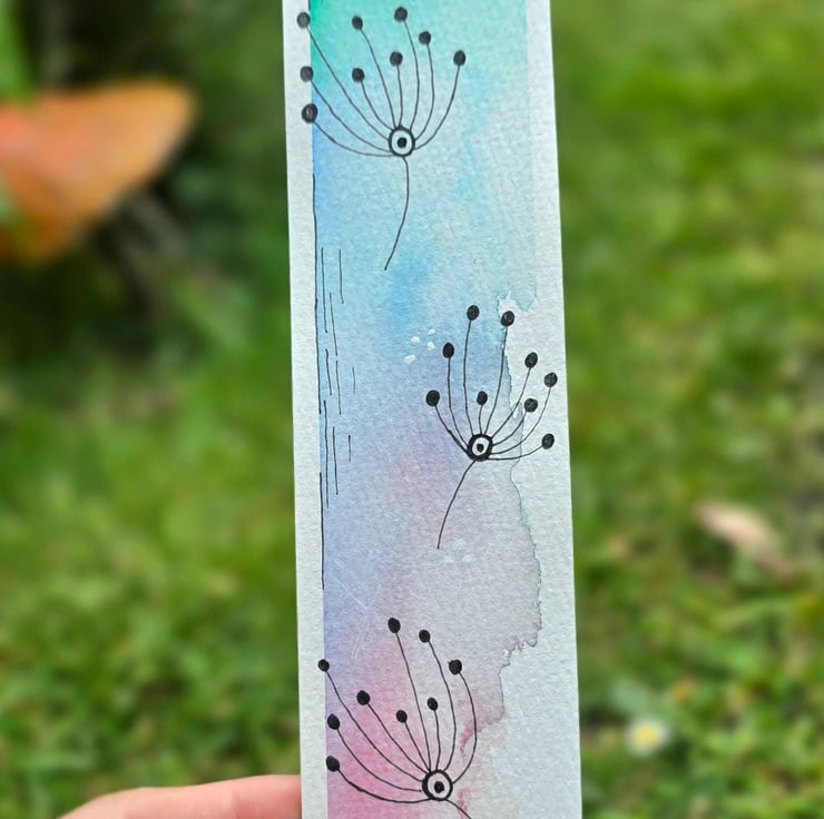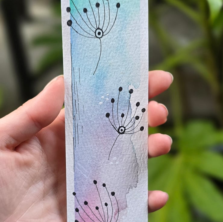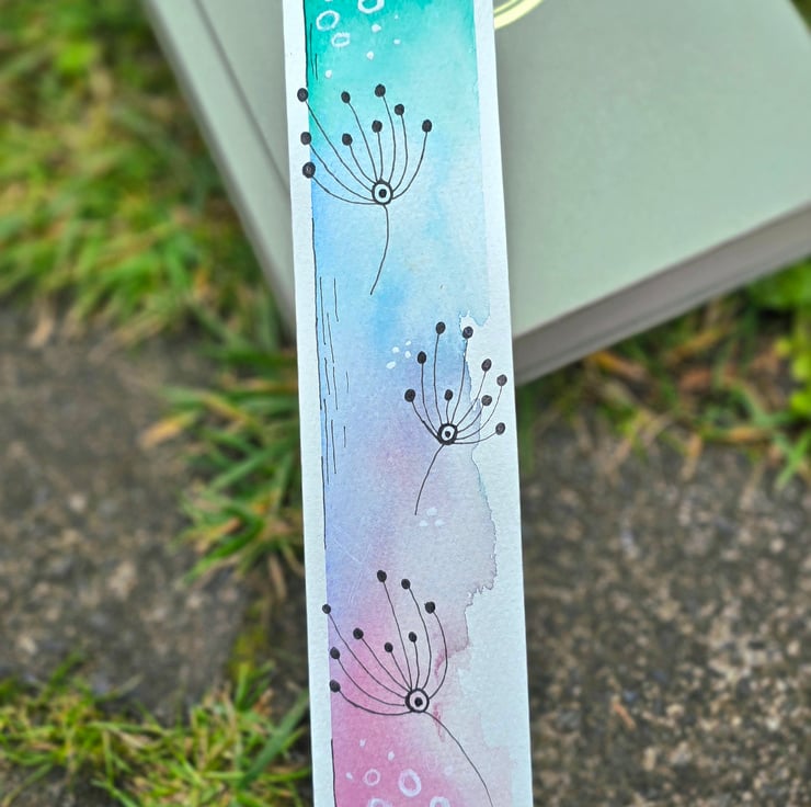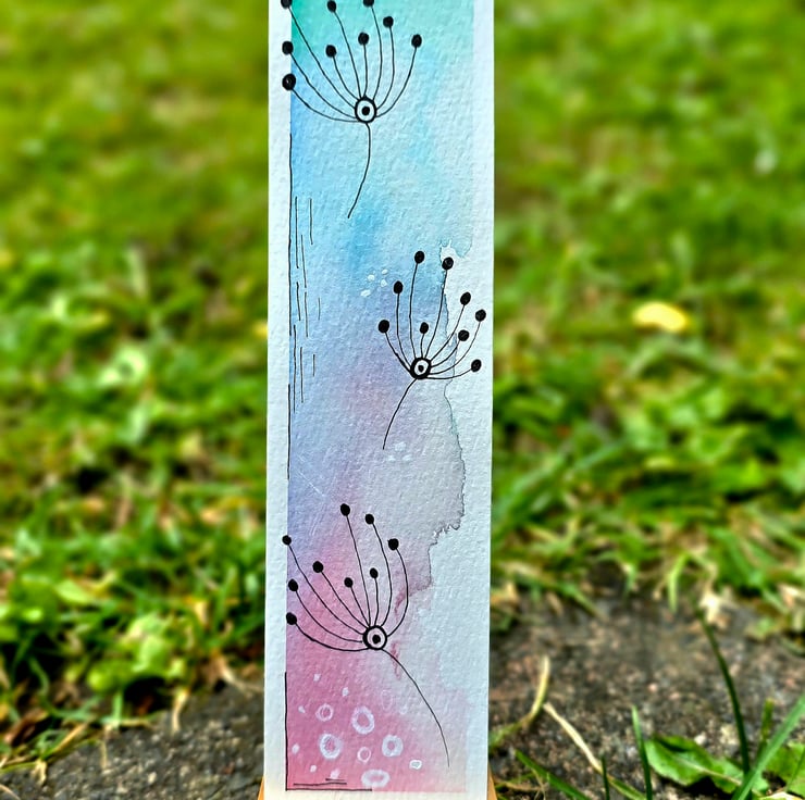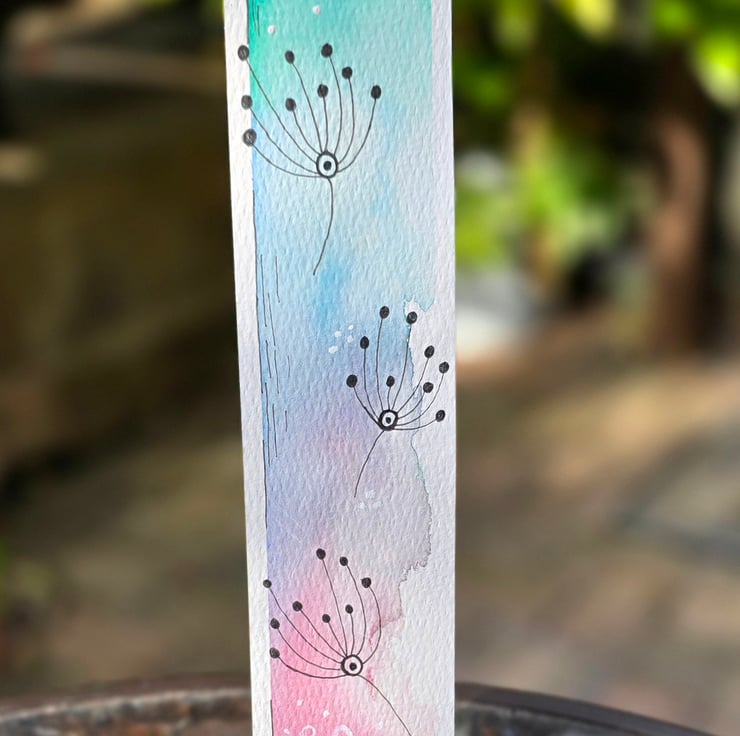This delicate, one of a kind bookmark is painted by hand on premium 300gsm cold press cotton watercolour paper. Featuring a dreamy blend of spring inspired colours from fresh aqua to soft lilac and gentle rose pink, this design captures the whimsical charm of dandelion seed heads drifting on a breeze.
