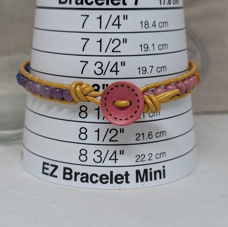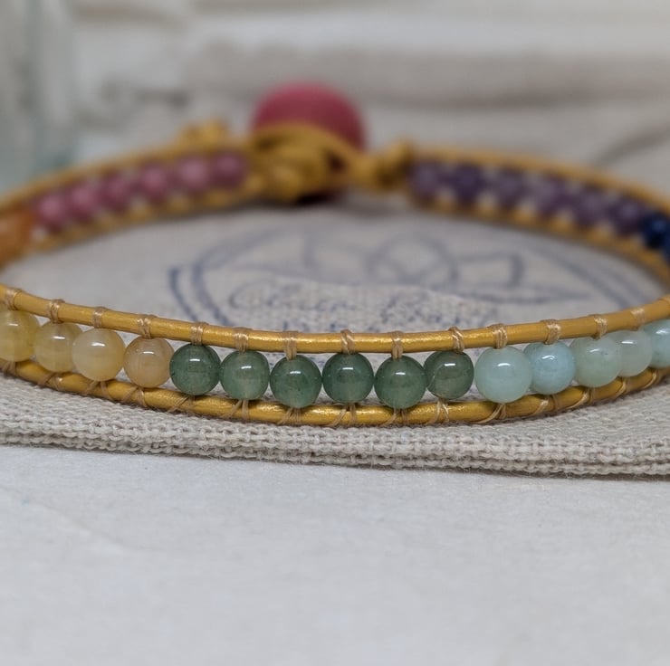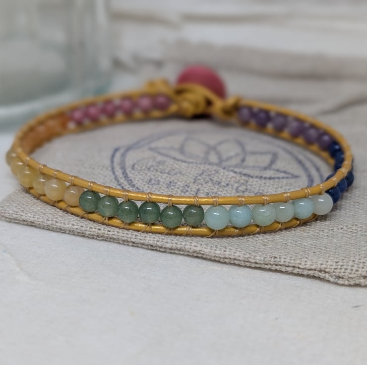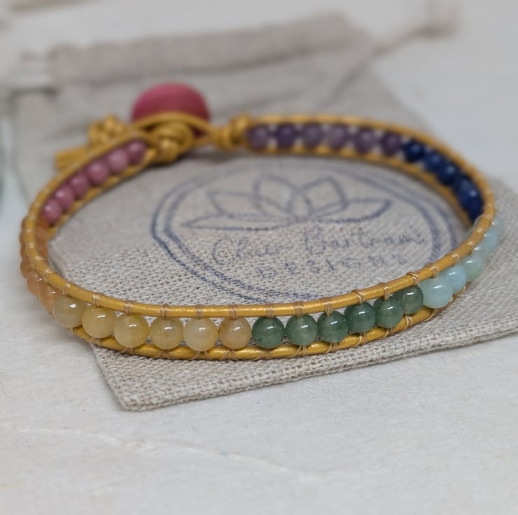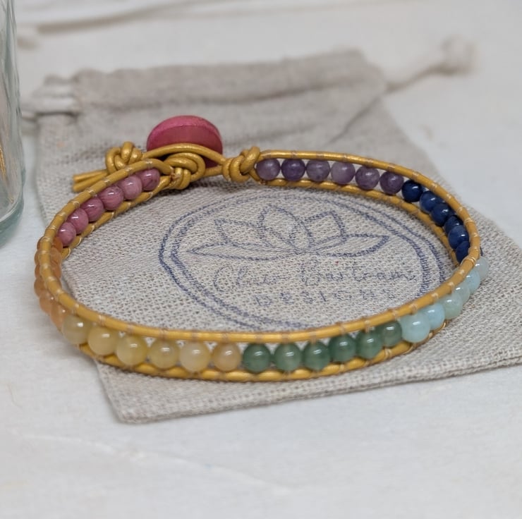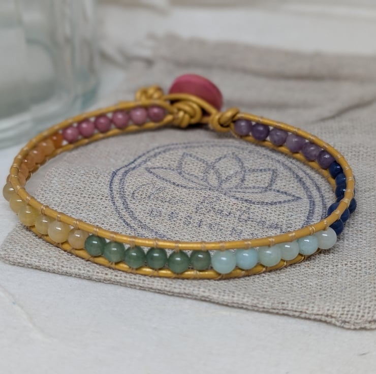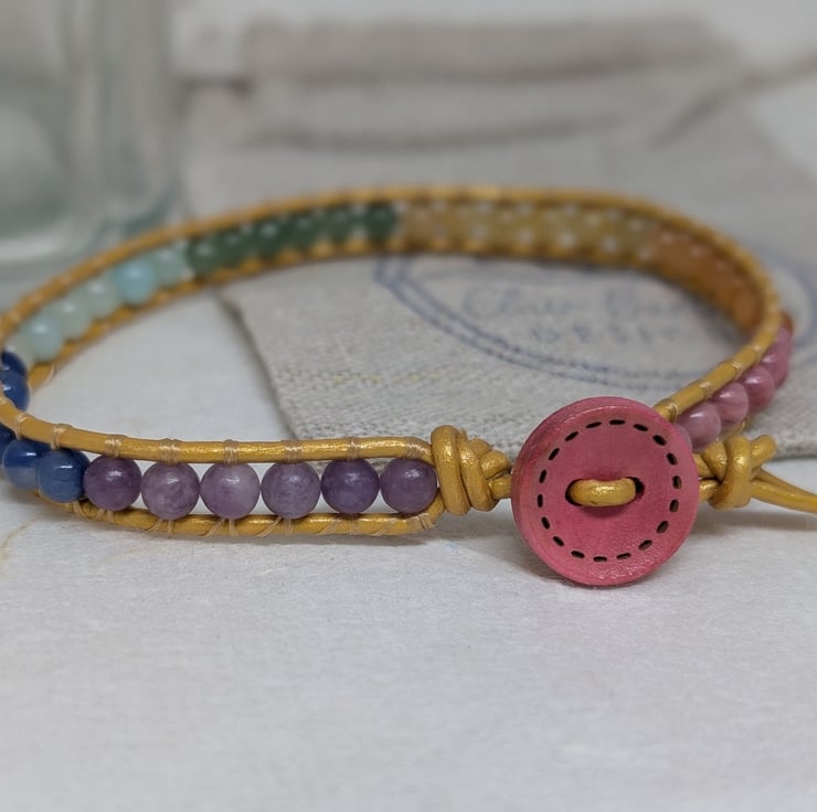 This cheerful bracelet is stitched with seven different gemstones in soft pastel rainbow shades-a mix of dreamy colours that feel gentle, uplifting and full of positive vibes. The stones are stitched to metallic gold leather cord for a little bit of shimmer, and it fastens with a cute pink wooden button.