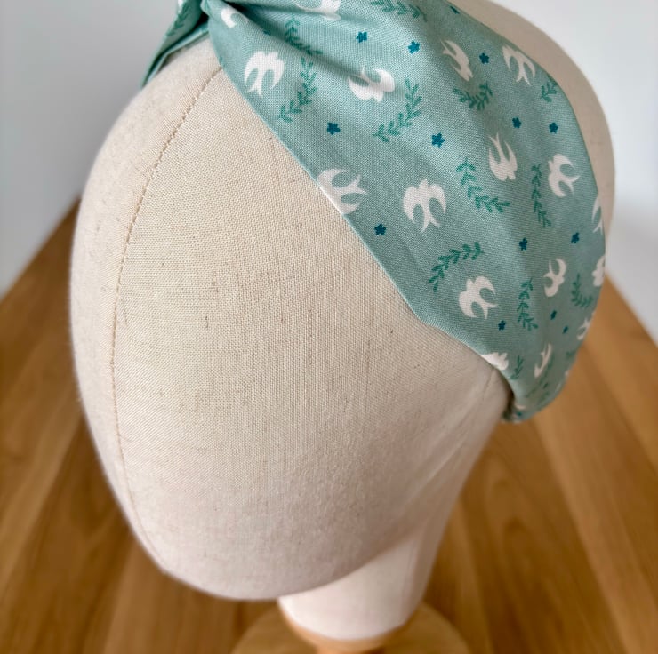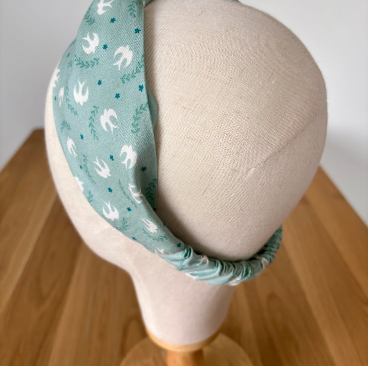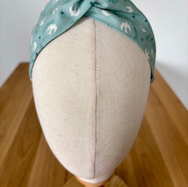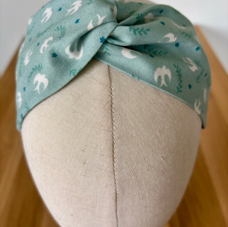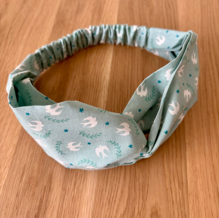 Handmade twist knot headband in soft 100% cotton, in a beautiful summery print of white birds on a pale green background.