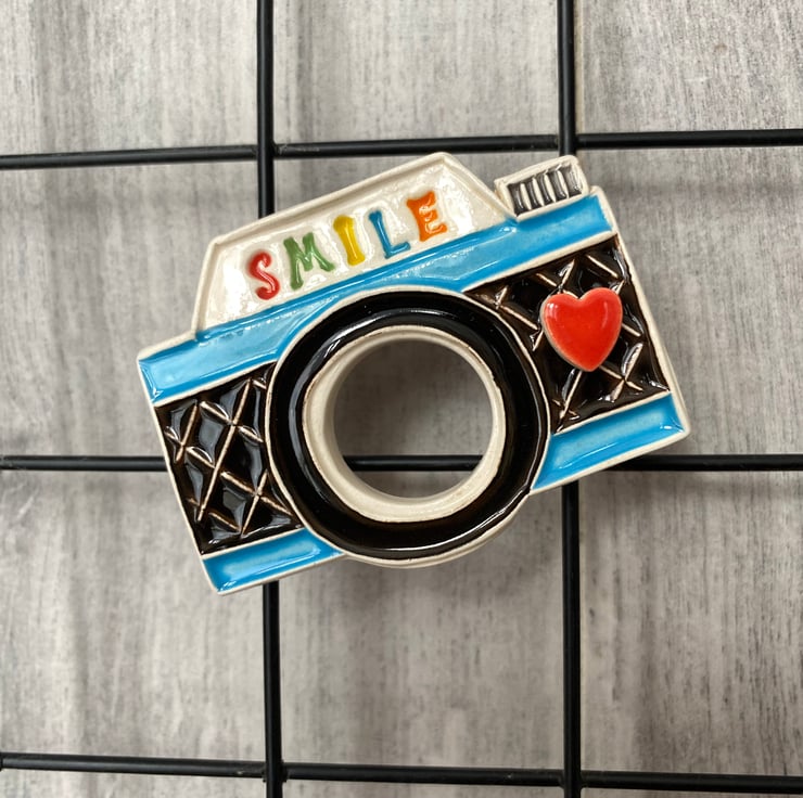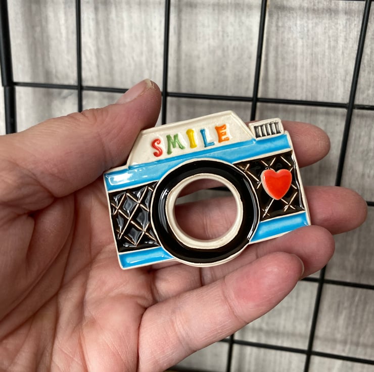This little ceramic magnet is my own design which I have carved and then stamped into the earthenware clay. Bright detailing has been added during the glazing stage and fired twice in an electric kiln. I have left the lens open so you could even use it to frame a small photo of someone you love or maybe even showcase a teeny picture of Princess Di!