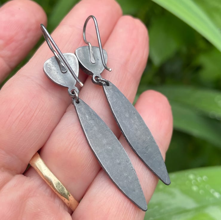The earrings hang 55mm total drop and are about 10mm at their widest.