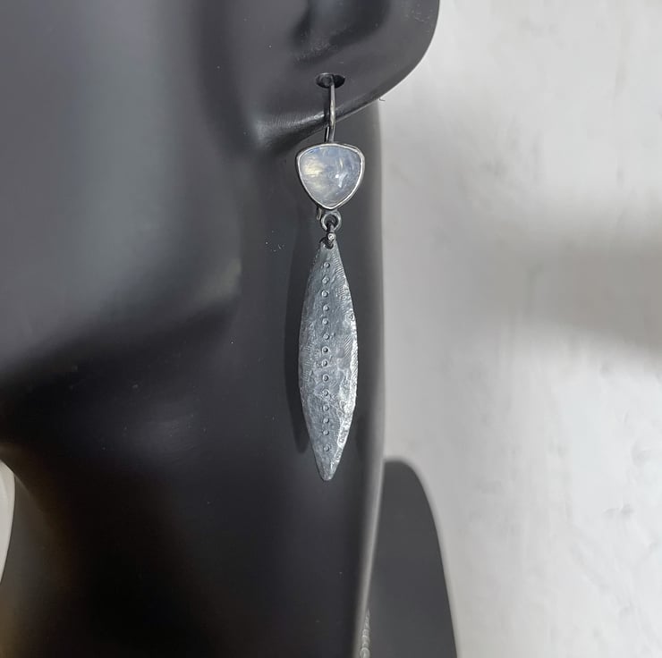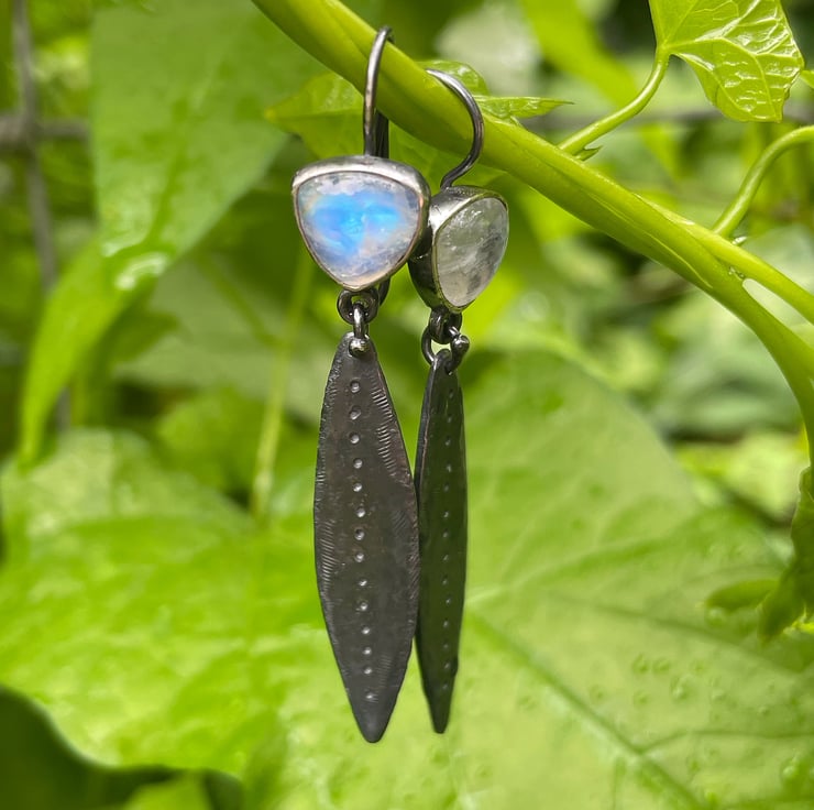 Beautiful flashy moonstone trillion cut cabochons sit above long textured oxidised silver drops.