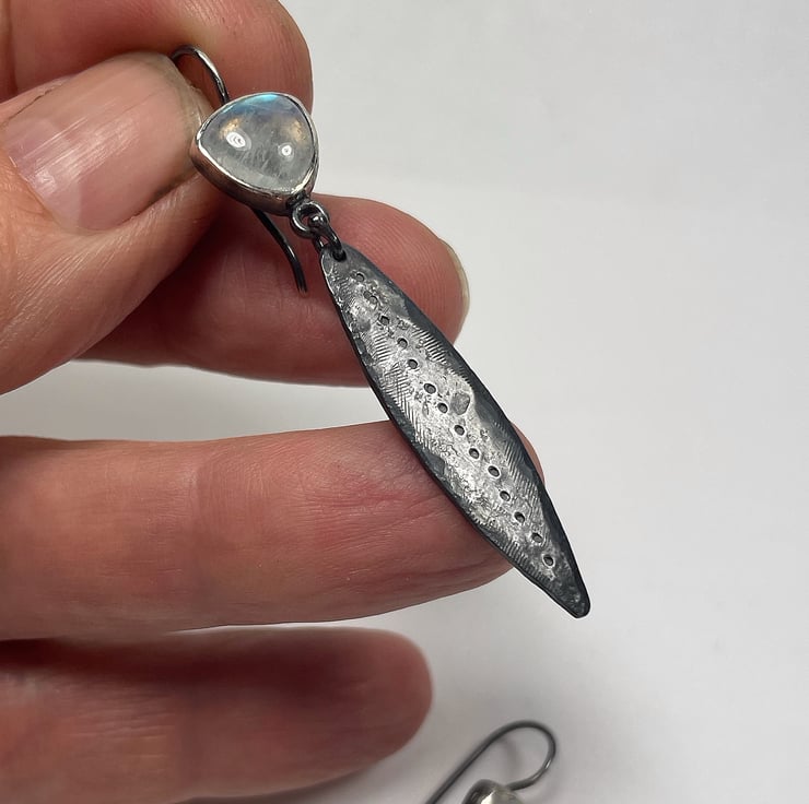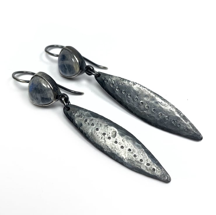 Long oxidised sterling silver and moonstone earrings with hooks.