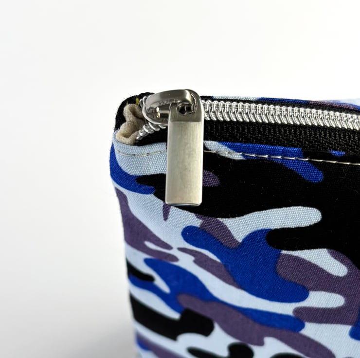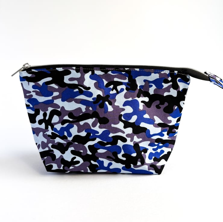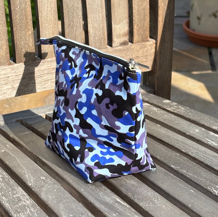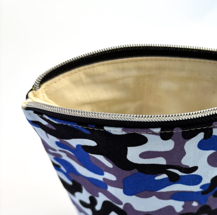 This trendy make up bag is made from a cotton camouflage print fabric in shades of blue and has a cream, cotton lining.