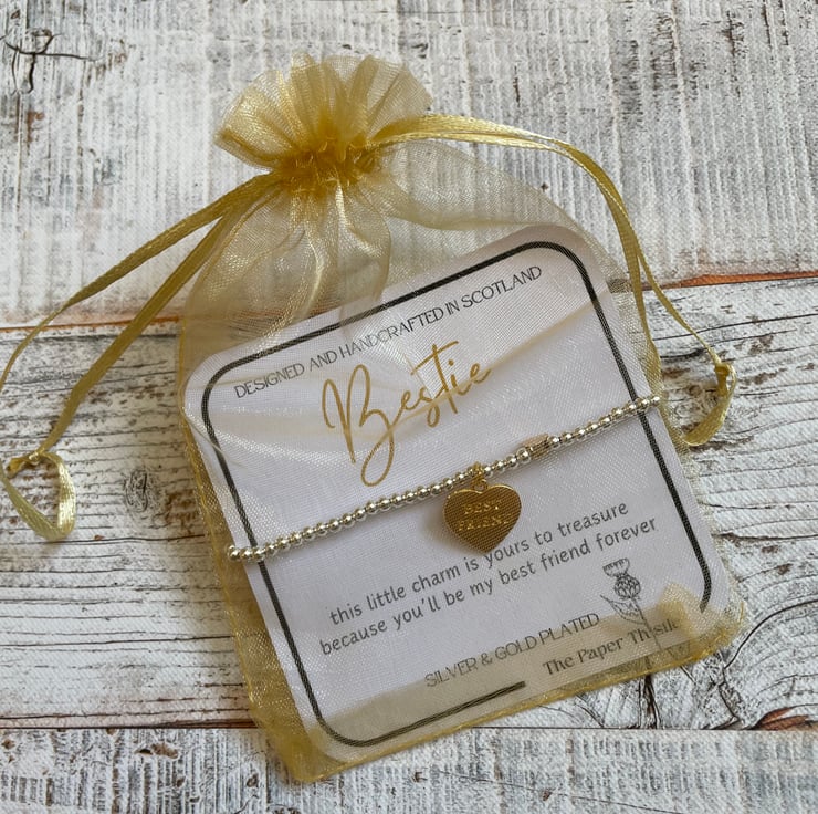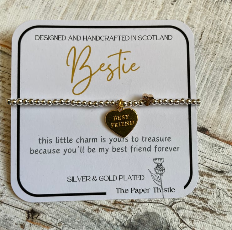 Stretch bead bracelet with signature gold heart and gold plated best friend charm.