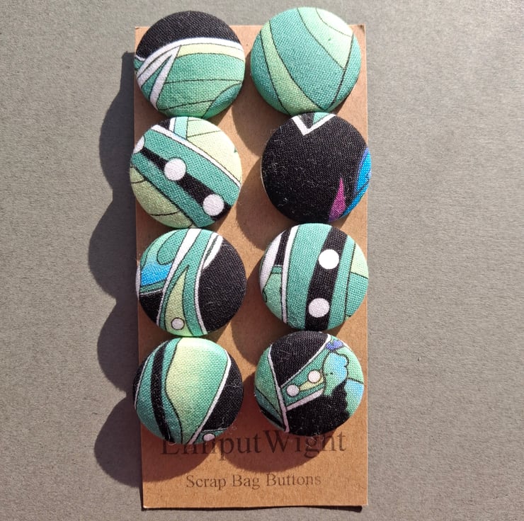 This set of eight buttons are metal buttons covered with scraps of cotton fabric with a green and black pattern. Each button is around 2 1/2cm across.