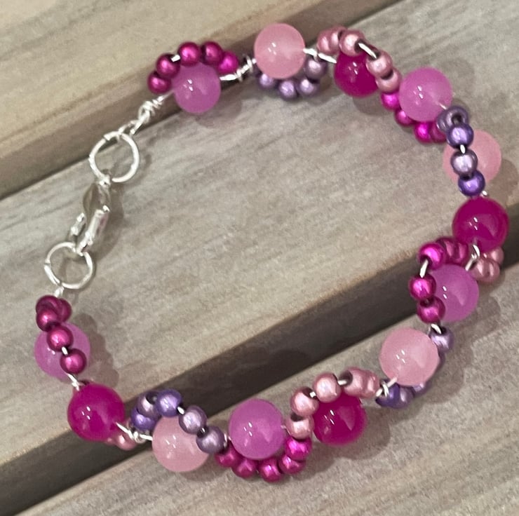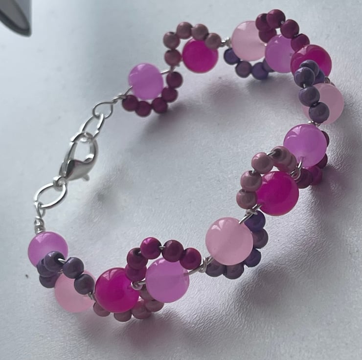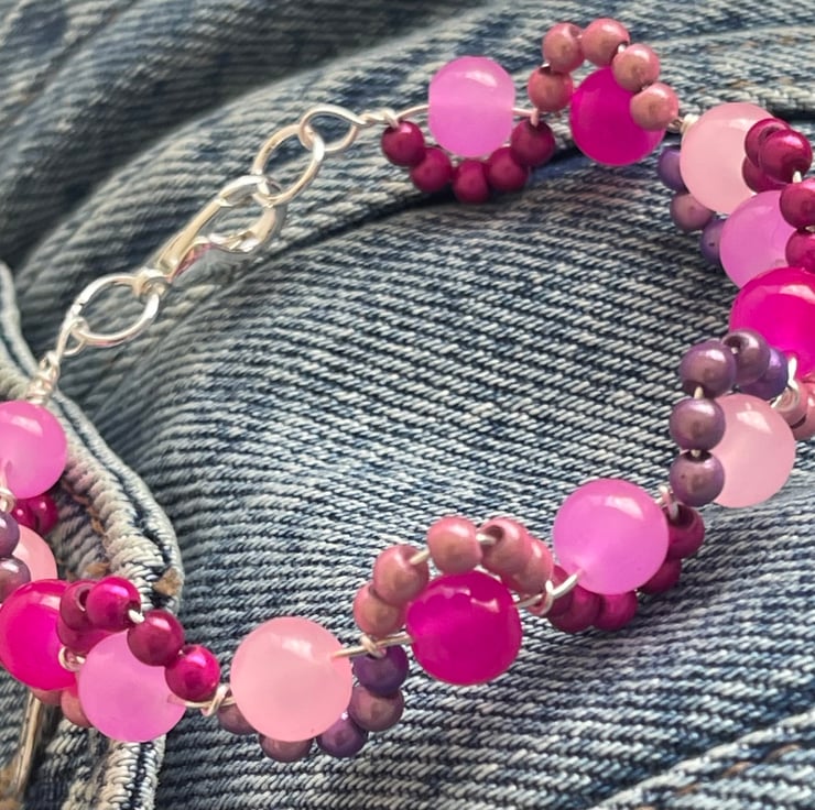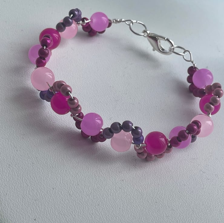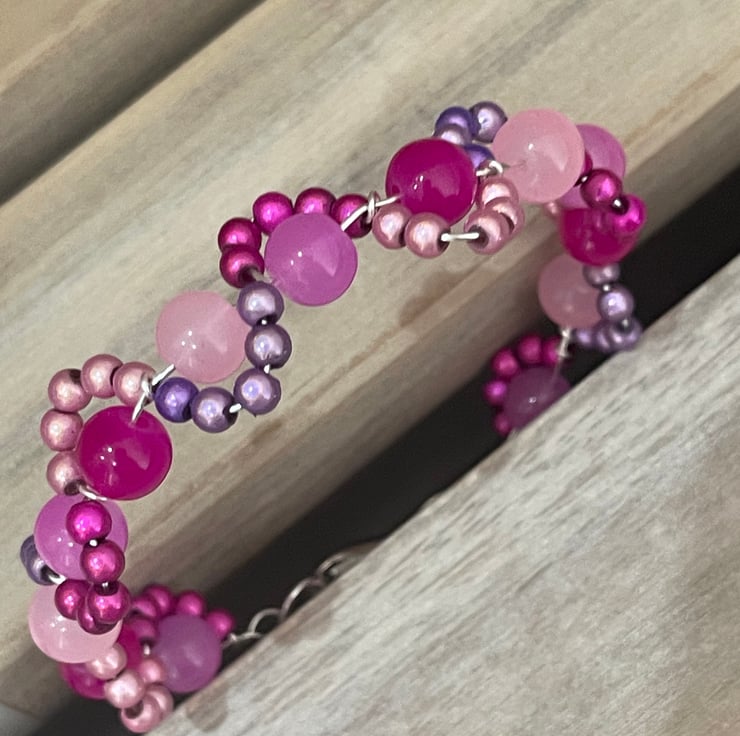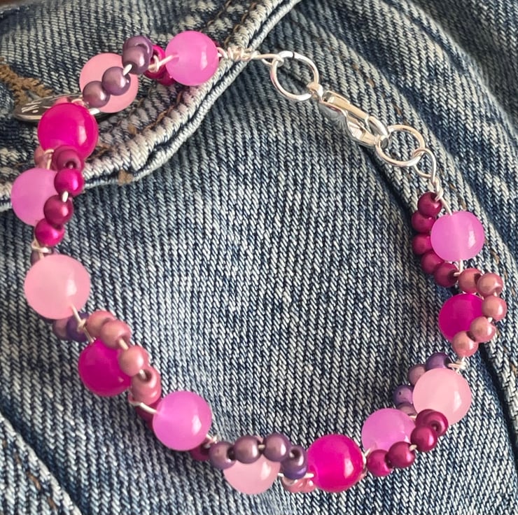 Gorgeous and pretty pink bead and wire bracelet, pretty mix of beads, pink tones glass beads enhanced by a wave of pink themed miracle beads that glimmer in an arc around the bead. These beads glimmer and glow in the light. A clever design that is unusual and both a delicate and a statement piece.