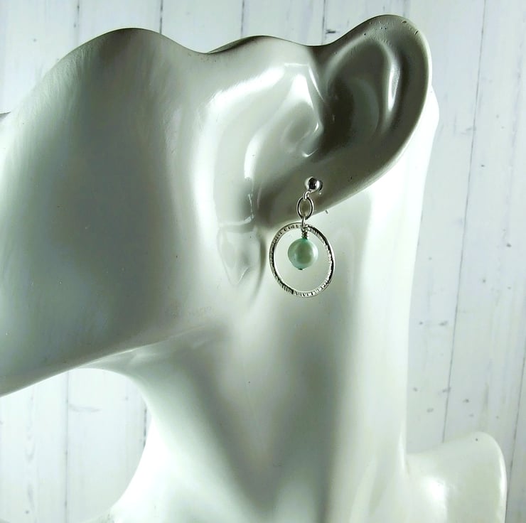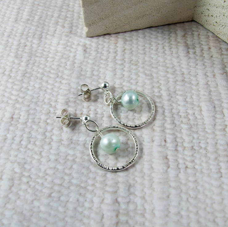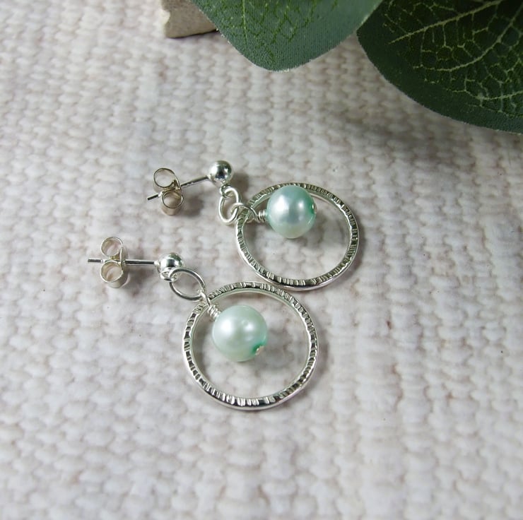 Sterling Silver Earrings. Silver circles with pastel green pearls and stud fitting.