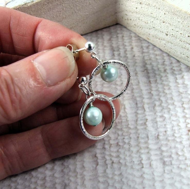 I first created the small circle using 1.5mm recycled sterling silver, shaped and soldered. Finished with a hammered texture. I have securely wire wrapped this alongside a pale pastel mint green freshwater pearl. Fitted to 4mm ball stud fittings.