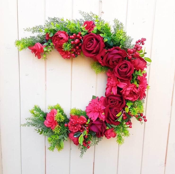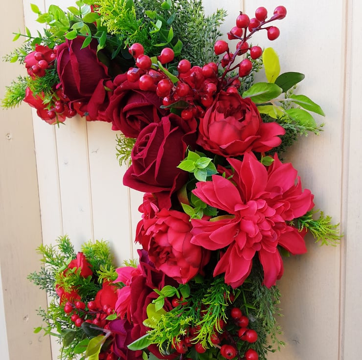 Rich red's, 42cm crescent wreath. Stunning red Rose's, dahlias, berries