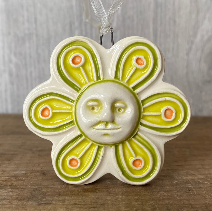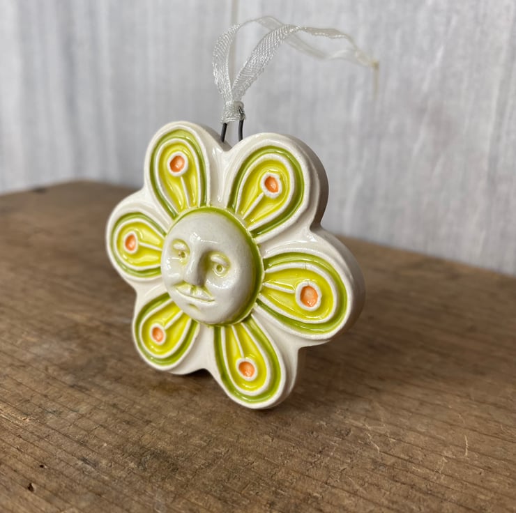 This unusual flower decoration is made from white earthenware clay and has a little moon face in the centre.It has been fired twice, once to the bisque stage and then a second firing for the glossy glaze. It measures 6 centimetres wide x 5cm height x 1cm thick and hangs from a cream organza ribbon.