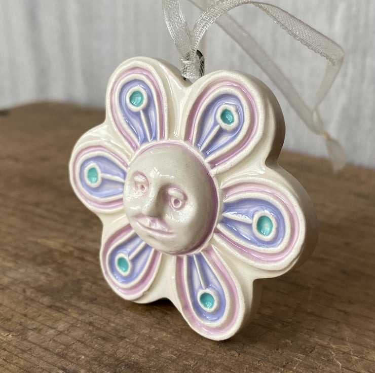 This unusual flower decoration is made from white earthenware clay and has a little moon face in the centre.It has been fired twice, once to the bisque stage and then a second firing for the glossy glaze. It measures 6 centimetres wide x 5cm height x 1cm thick and hangs from a cream organza ribbon.