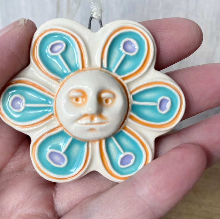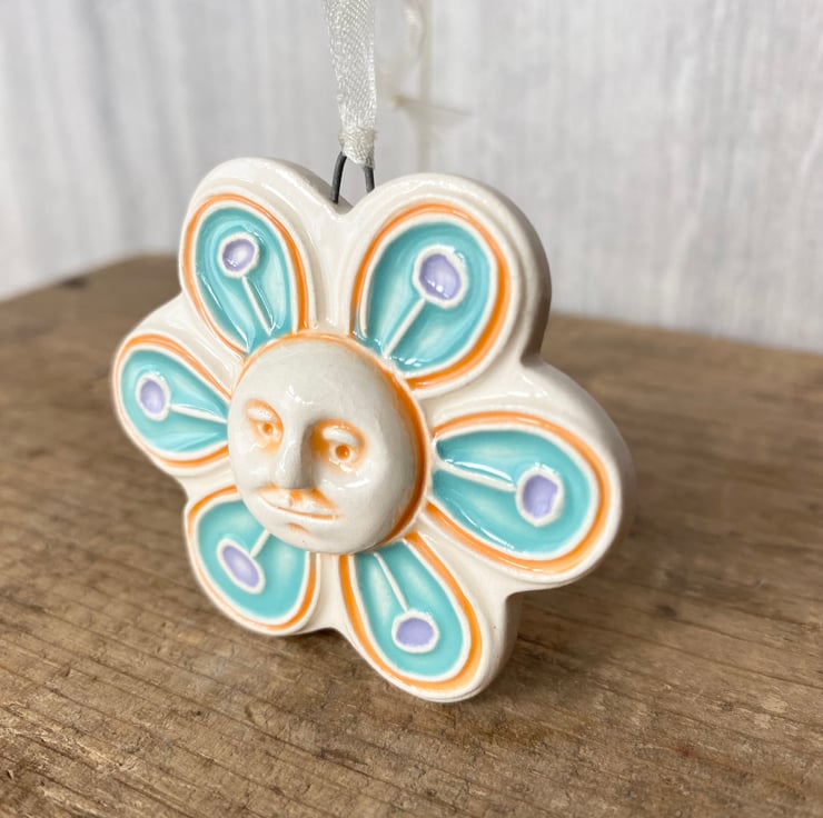 This unusual flower decoration is made from white earthenware clay and has a little moon face in the centre.It has been fired twice, once to the bisque stage and then a second firing for the glossy glaze. It measures 6 centimetres wide x 5cm height x 1cm thick and hangs from a cream organza ribbon.