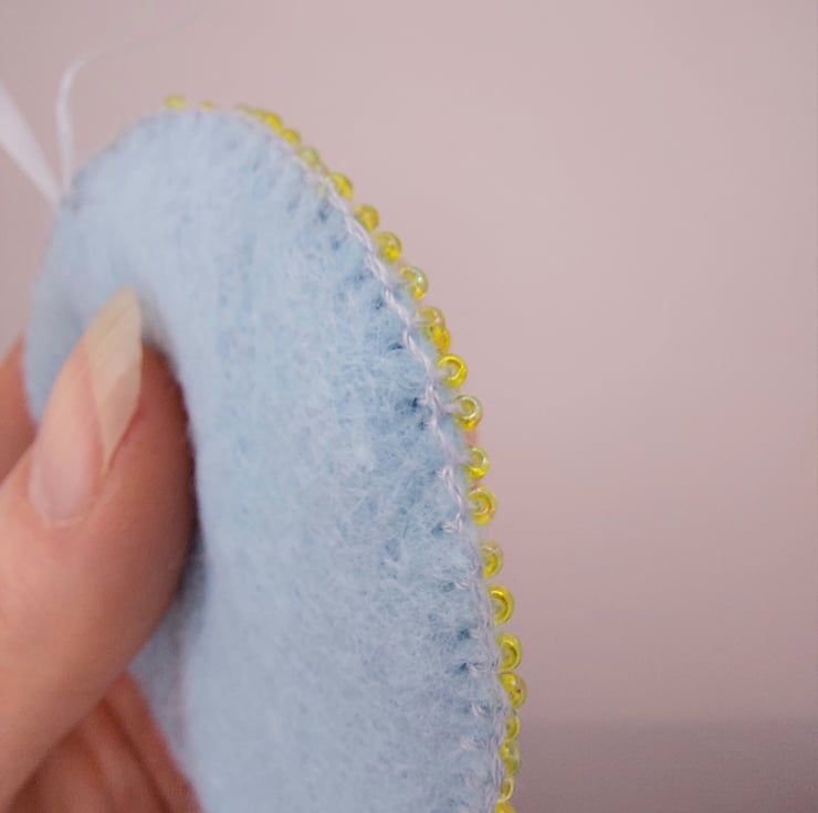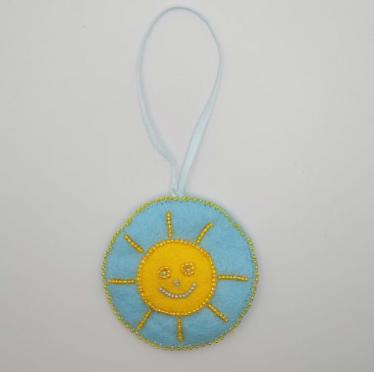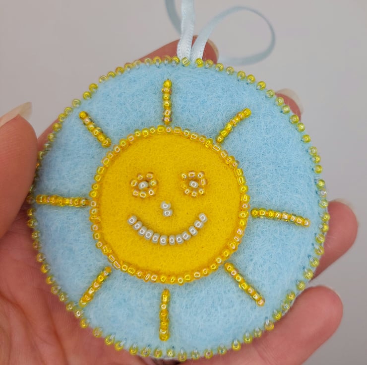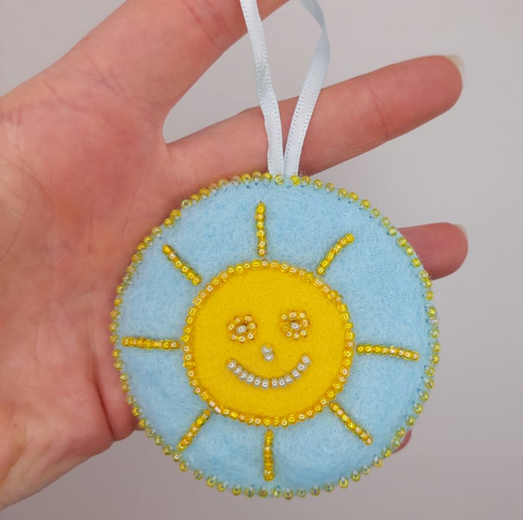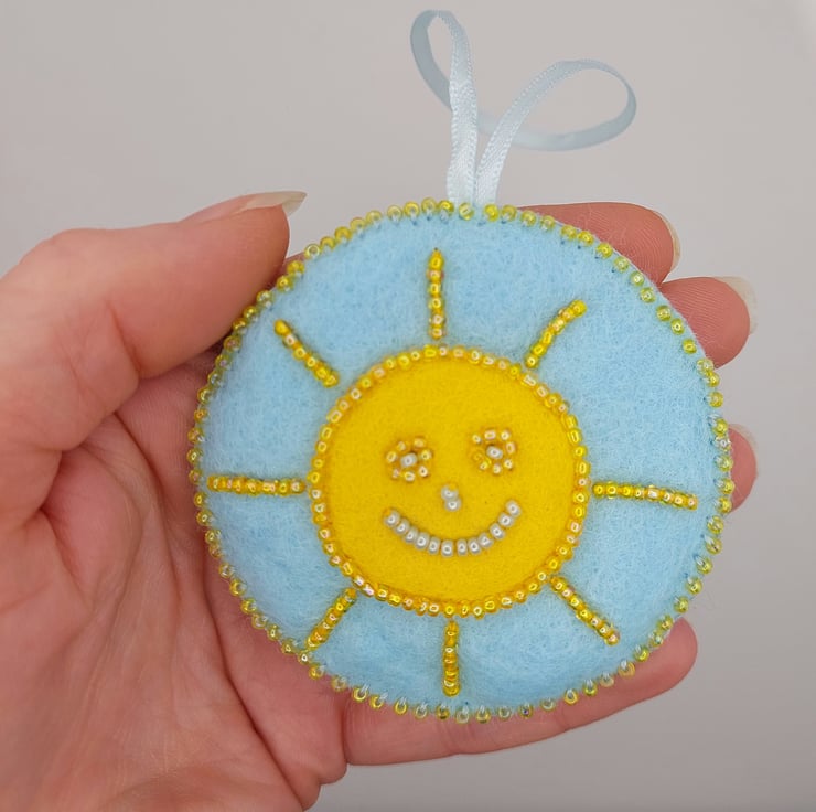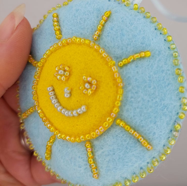 Measuring approximately 7cm in diameter (plus a little extra for the ribbon hanging loop), this happy sunshine is stitched onto a pale blue felt base with a vibrant yellow felt circle at the centre. The sun’s smiling face is carefully bead embroidered, bringing it to life with sparkle and character. A hand-sewn beaded blanket stitch borders the piece, joining it to a second layer of pale blue felt on the reverse for a neat and sturdy finish.
