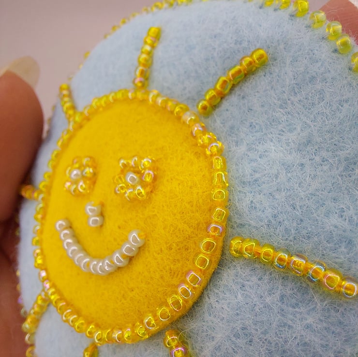 Brighten someone’s day with this cheerful, handcrafted smiley sunshine decoration – lovingly made using bead embroidery on soft felt.