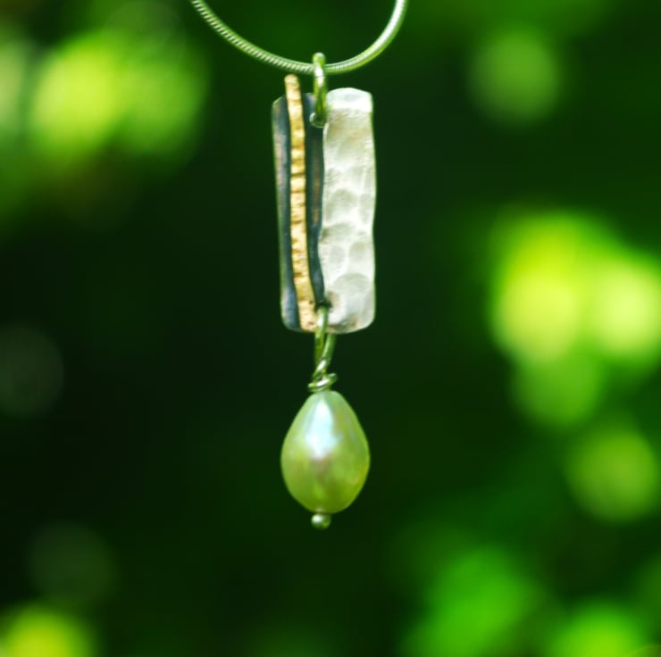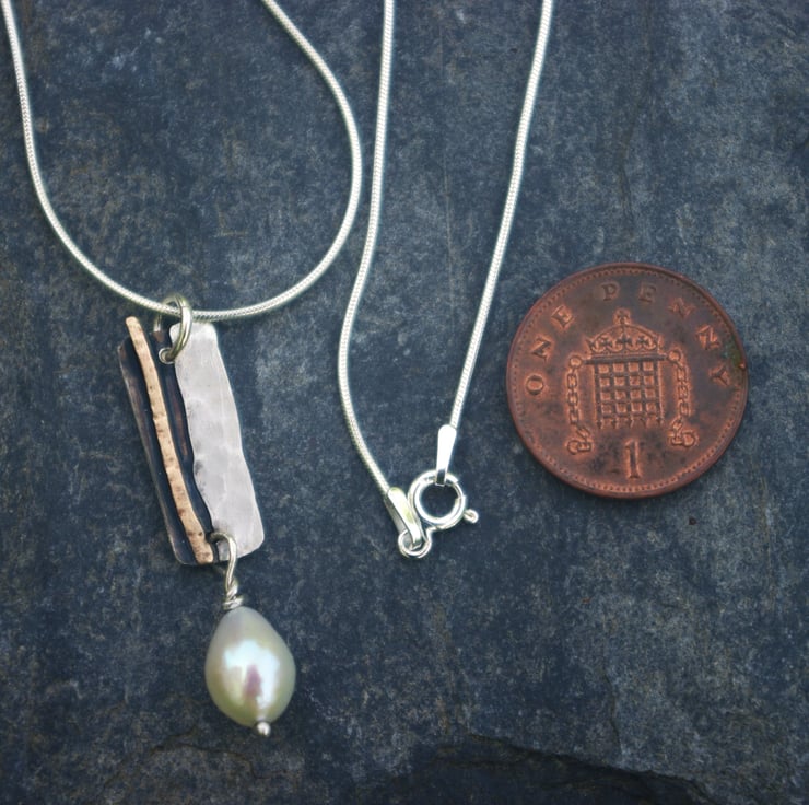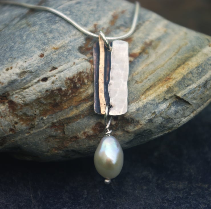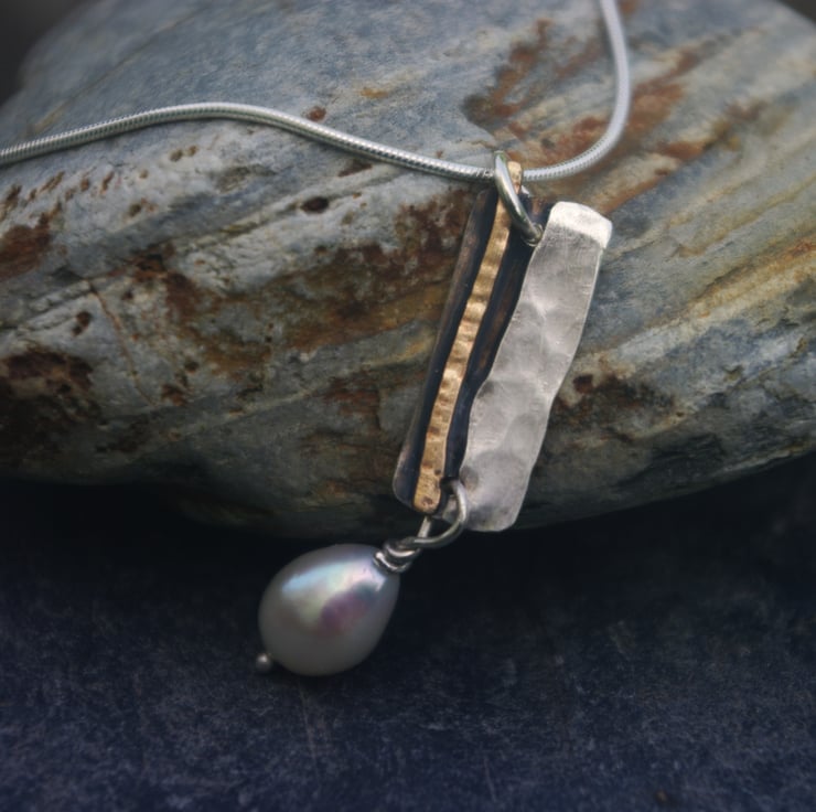 Sterling silver and gold pendant with a Freshwater Pearl inspired by the strata of the west Wales shoreline. It has textured decoration made with hammered sterling silver and gold filled wire. The gold filled wire is 12% gold and is more durable than gold plated. I have oxidised the silver to a grey/black colour, behind this gold piece, to make the gold colour stand out.