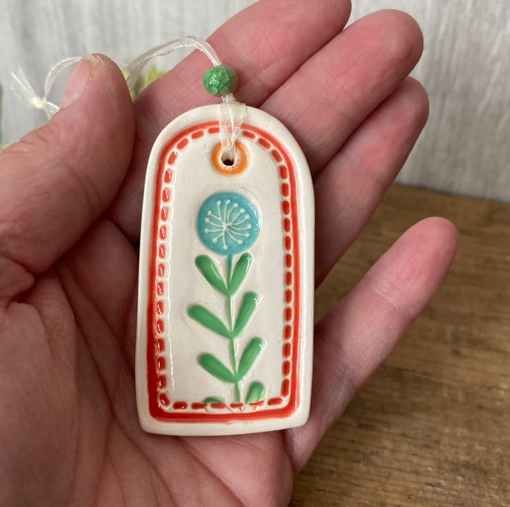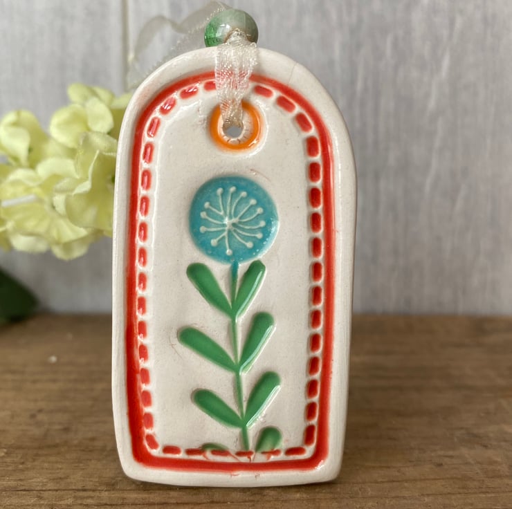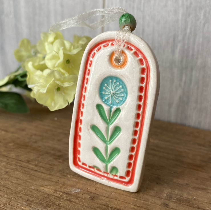 This little gift tag decoration is made from white earthenware clay and decorated with a flower design. It has been fired twice and finished with a glossy glaze for a lovely smooth finish. It measures 6 x 3cm and hangs from a cream organza ribbon.