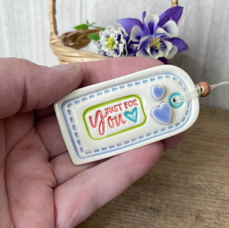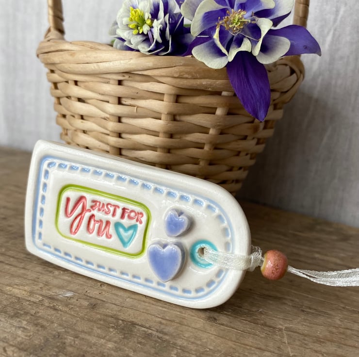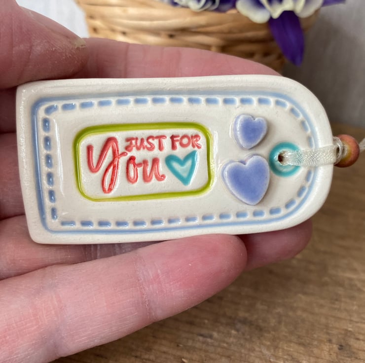 This little gift tag decoration is made from white earthenware clay and decorated with a loveheart design. It has been fired twice and finished with a glossy glaze for a lovely smooth finish. It measures 6 x 3cm and hangs from a cream organza ribbon.