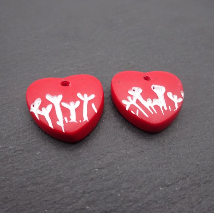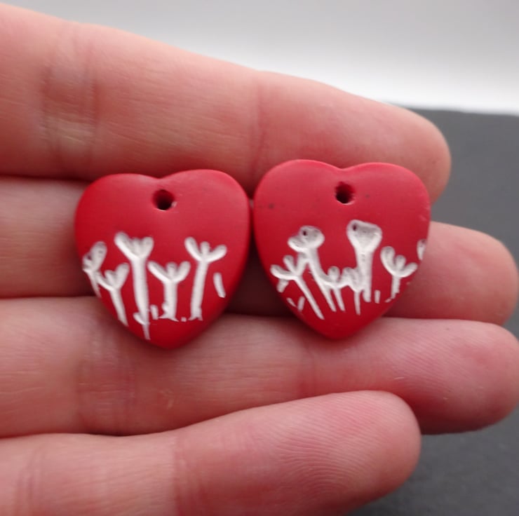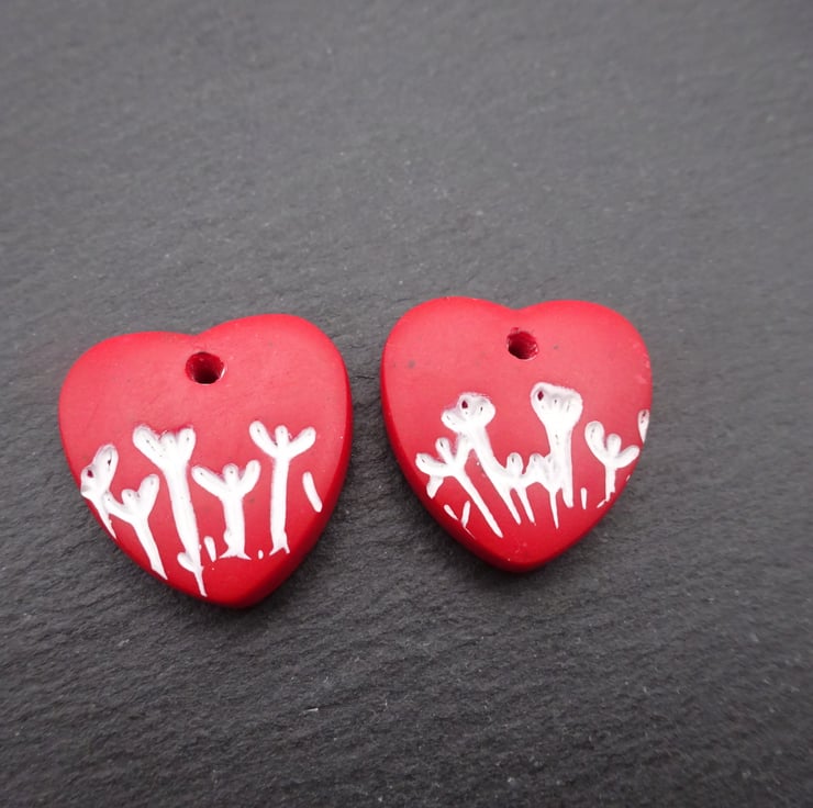 A pair of red hearts made with polymer clay and featuring white flowers.