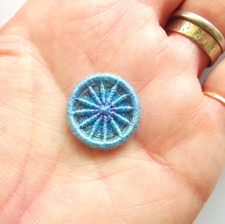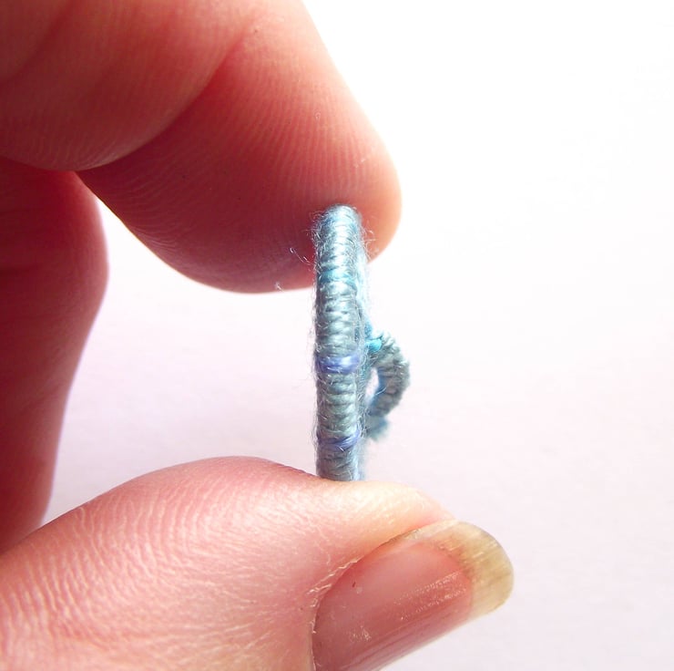 I used a beautiful variegated blue silk thread and metal rings to make this set of six 2cm