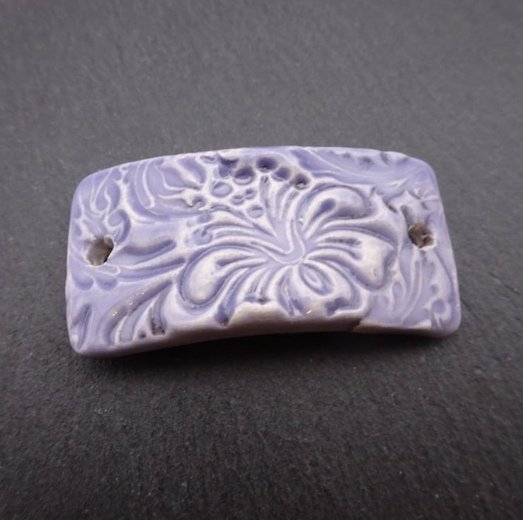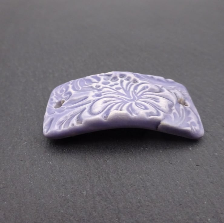 A ceramic bracelet bar with a purple glaze and flower pattern.
