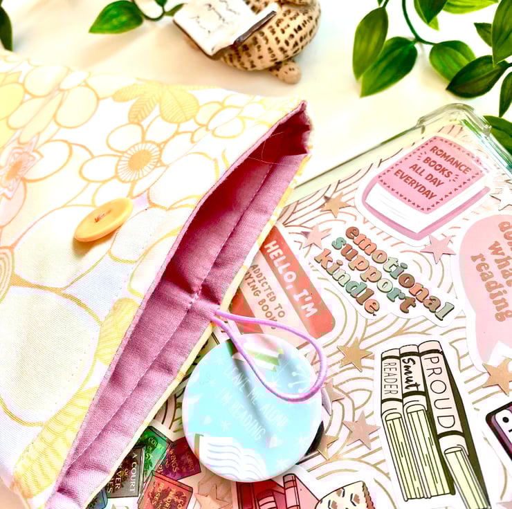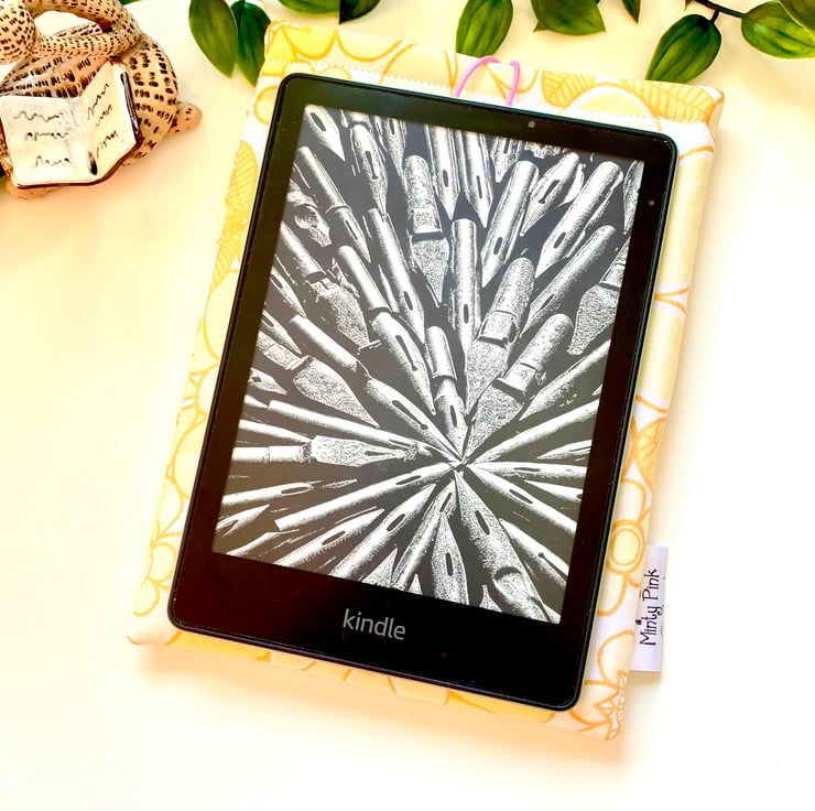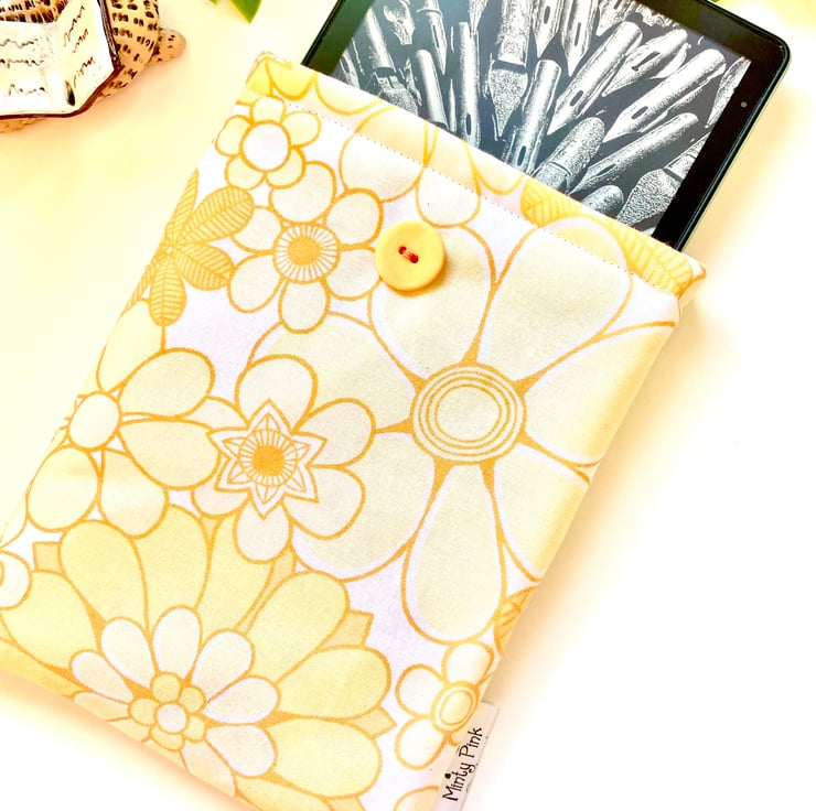 Handmade vintage lemon retro floral padded kindle sleeve / e reader case. It has a contrasting lemon cotton lining. This lovely fabric sleeve has been made to fit various sizes of kindles, please see below.
