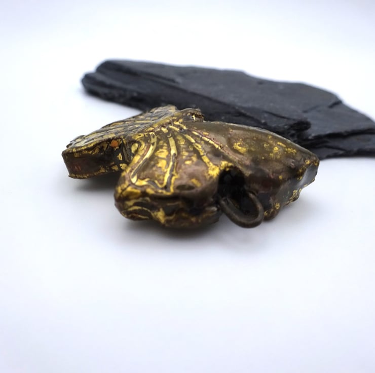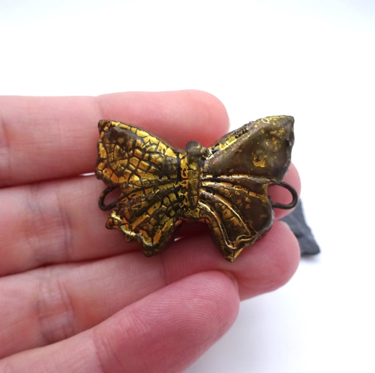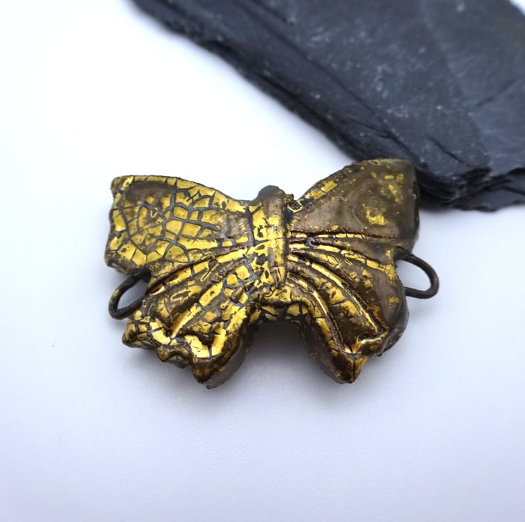 A ceramic butterfly bracelet bar with a gold crackle glaze.