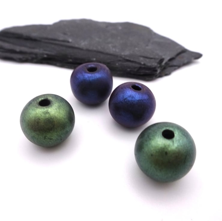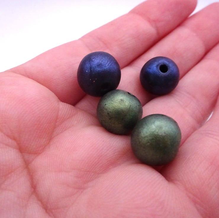 A set of 4 polymer clay sphere beads, two have green glitter and two have purple glitter.